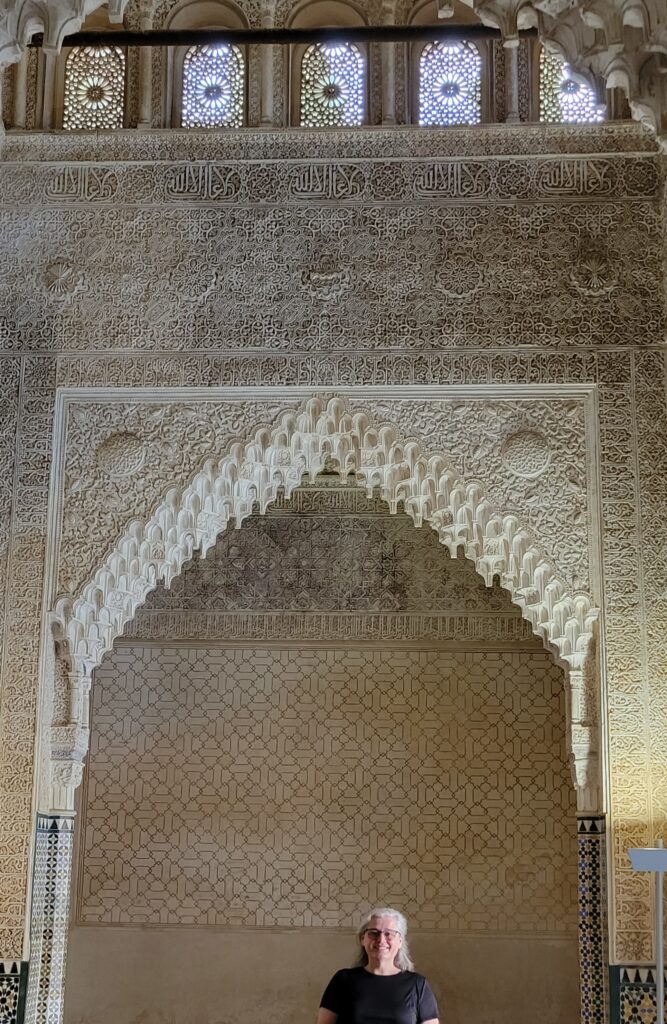We walked there, about 2 miles with the last 1/2 mile (a steep uphill) entering into the palace area. We had tickets for 0900 timed entry into the palaces part of the complex. Most of the complex has been restored due to damages sustained over wars, time and natural disasters, i.e. earthquakes. It was started in 1200’s, built by Muslims (on an earlier site), in the foothills of Sierra Nevada Mountains. It came to be under King Ferdinand and Queen Isabella in 1492. Christopher Columbus had gained favor for his travels to (Americas) West Indies from the King and Queen in Alhambra! (Cool fact). Anyway, the Spanish do many “modifications” to the whole Alhambra complex. 1828 saw restorations (to return it back to Islamic Architecture) beginning. 1830 Washington Irving lived in Granada and wrote about it, as well as others, and brought about more favor in restoring Alhambra. In 1870 Spain declared it a National Monument. In 1923, Leopoldo Balbas, was in charge and credited as doing the best in restoration. In 1984, Alhambra received a UNESCO World Heritage Site.
