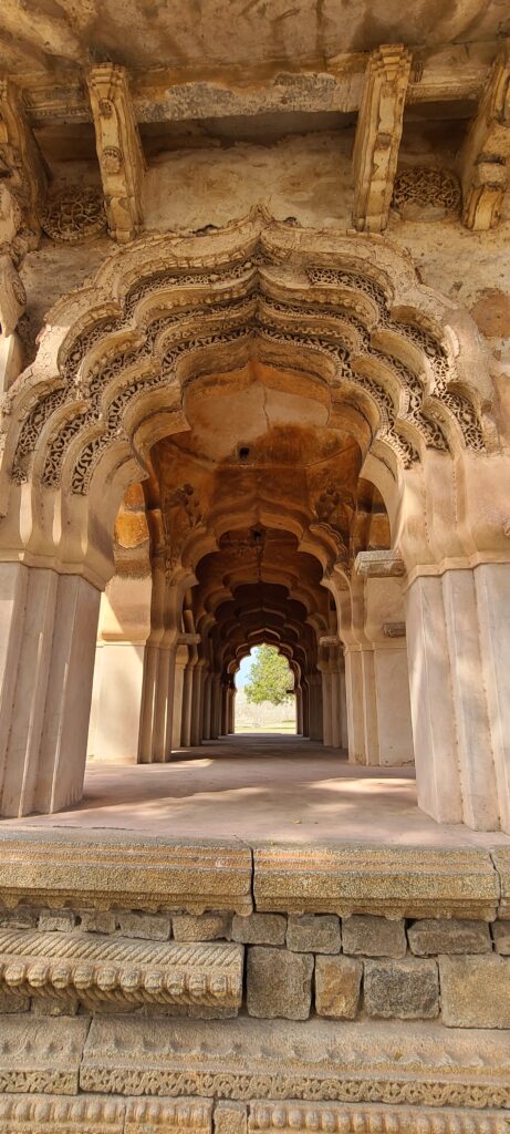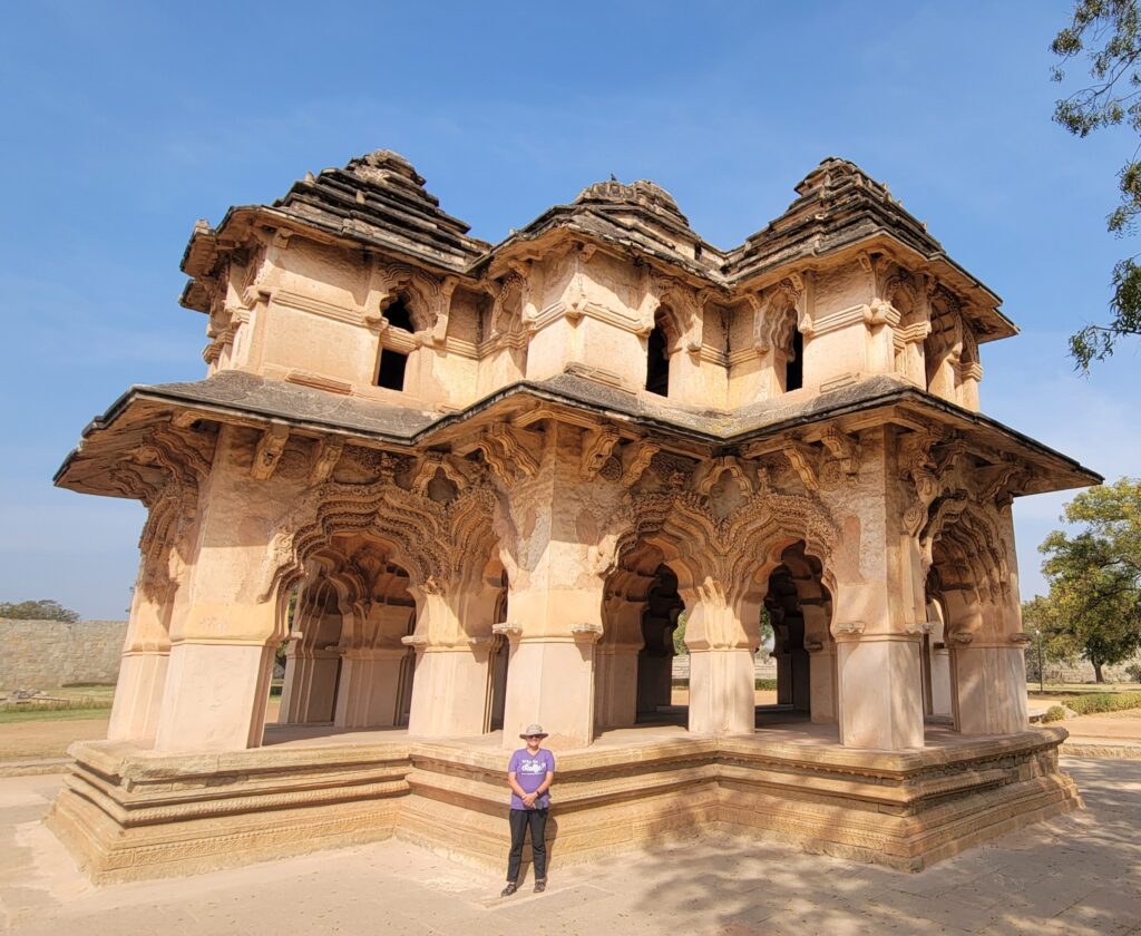 We go to Zenana Enclosure. Here it is fenced in and we buy a ticket (to pay for this and only two other pay places). This enclosure has Jal Mahal, a water pavilion or tank. Next was the foundation of the Queen’s Palace, which was a pretty elaborate foundation. Now was the best ruin here, Lotus Mahal. It is a two story, building. The first story is open with pillar that are topped by many arches. It made for a very picturesque setting. You can not go in it – to the second story, and the placard does not describe what this structure is for. But nonetheless it is fascinating. Then there were more Watch Towers. Next is the Guard’s House, which has been converted to a ‘sculpture garden’. It, too, has an arched corridor, but the middle is open to the sky and elements. It showcases many sculpture carvings of the Hindu gods. We left here for the Elephant’s Stable. It is thought to be a elephant’s stable, or maybe, an administrative building for the palace… in other words they do not really know it’s function. But the title of ‘Elephant’s Stable’ must be the prevalent theory as the building is given this title. (It is the one I like to imagine the best.) This impressive building has eleven domed chambers. The domes are different, but symmetrical from one side to the other. Each chamber is large enough to “pen” an elephant. The Guard’s House and the Elephant’s Stable make up two sides of a plaza or squared open area in front of them. [The square is being set up with a stage and chairs for the upcoming festivities this weekend. There is supposed to be a big influx of people, due to a minister coming. (i’m personally glad we won’t be here for this.)]. From here we go to several lesser temples in this enclosure area. They were great in their own right, but this area kept going… and going. We wrapped it up and went back to our tuk-tuk to move on.
