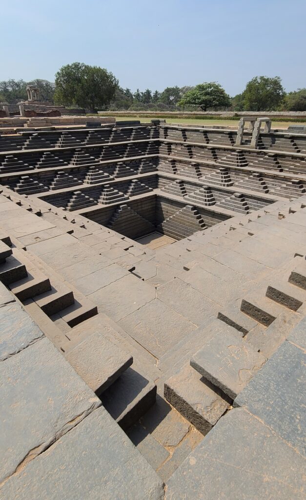 Next area (this is still under the Royal Center supercomplex area) was Mahanavami Dibba. It is known as a “great platform” structure. [I am going to put in a qualifier here: much of the information I am writing about is from placards that relate their information from a Portuguese traveller… so yada, yada, yada,… there is a bunch of probable’s and maybes, with little definitelies.] Anyway, the platform is a great overall view of this area. The structure itself is made with some very dark, green schist (appears black) alternating with the sandstone and granite, giving a standout contrast. Then there are many other structures here, but we went to the primary structure, the Blackstone Pushkarani. It is a most unique tank or pool. It is made solely of this dark, green schist and was only excavated in 1988! The pool is very deep, consisting of five stages of stepping platforms, leading down to the final much deeper sixth stage. The steps going down are symmetrical and very precisely uniform. It is a great example of precision cutting and presents a very aesthetic look. Really amazing! And just excavated in 1988 – Incredible! We wandered around a bit more, but essentially, load back up into the tuk-tuk.