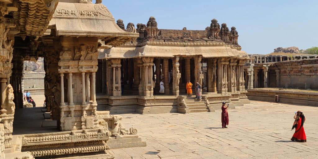 We arrive to the third and final pay place on our ticket, Vitthala Temple Complex. But our tuk-tuk has to drop us off and we have to either line up and take an electric cart one km to the complex or walk it. Our tuk-tuk driver recommended us to walk because he wants us to be done and back in 30 minutes! Really!?! Well, that is not happening. But we did not dawdle, and felt pressure to return before we were ready. Anyway, we walk down the very wide Vitthala Bazaar area. We passed by Kuduregombe Mantapa, which is a temple on the way to the complex. It is outstanding because of the sculpted horse carved pillars lining the porch of the small temple. They were still in great condition and somehow seemed more red colored stone. We finally arrived at the complex to a mostly intact multi-storied intricately decorated gate entry. Once inside there is just so many lesser shrines and temples of this complex, but the carvings are by far in the best condition we have seen in Hampi. The workers were also at the ‘top of their game’, so to speak. The elaborateness and intricacy of the carvings… so labor intensive. Some of the pillars have like twelve carved columns in each pillar. Simply… Amazing!! We meander around in awe. Every angle is seems a great picture. We had a nice diversion with a chipmunk-like squirrel in one of the temples. Then the piece in this complex that everyone comes to see – the stone car, or stone chariot. It is a multi- sectioned carved carriage or chariot. Beautiful!