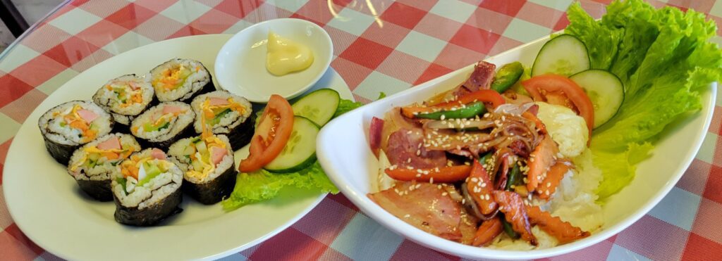 Around 1630, we set out exploring and finding some supper. the temperature is cool and nice. We went along the lake to the end where it kind of meets the ocean… they are reclaiming land here also, so the ocean is in the further away. The town of Cat Ba is sandwiched by the mountains and the ocean. So to accommodate the tourism here, they have to fill in the ocean in order to build more infrastructure. Too bad, as where we are walking is a lovey promenade what was once along the ocean… in five years it will be different. Anyway, we found a highly rated restaurant – Bong Cat Ba. We had Kimbap, Korean sushi rolls; Vietnamese Beef Stew & Bread; Vietnamese Bacon & Onion Stir-fry with rice. I had a mango smoothie, Jeff a beer. So Yummy!! As we were finishing eating, sunset started. It was glorious – our first good one in awhile. We enjoyed and then went to a convenience/grocery store, X3, to find what we needed. Back to our hotel, we relaxed watched some You tube then went bed by 2130. I like Cat Ba!