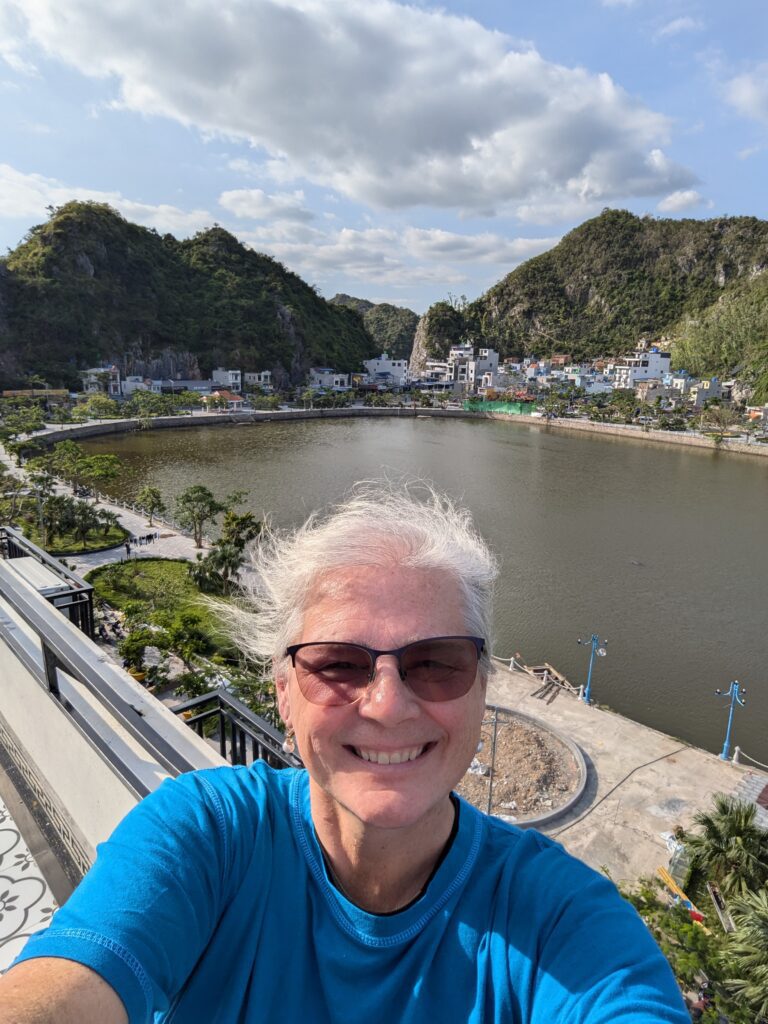 Now we reverse and all get on another bus, then go to the cable car stop over and pick up those same 5-6 people, whatever🙄!! The bus now takes each of us to our hotels. It finally arrives into Cat Ba town (on Cat Ba Island, but the bay is Cat Gia Bay). We are the first ones off in town. We are staying at Bao Phuc Hotel. We check in and were escorted to our room. It is 1445. Our room is on the third floor of a five story hotel. It is a typical hotel room: big bed, but it’s softer than some; bathroom with a wet shower; a small desk; a small table with two chairs; an AC; awesome view; and a bar minifridge and a kettle. We do not have a kitchenette, but don’t need one – as our breakfast is included (and food being as cheap as it is in Vietnam, we will definitely be on budget). The hotel room only cost us $13/night.