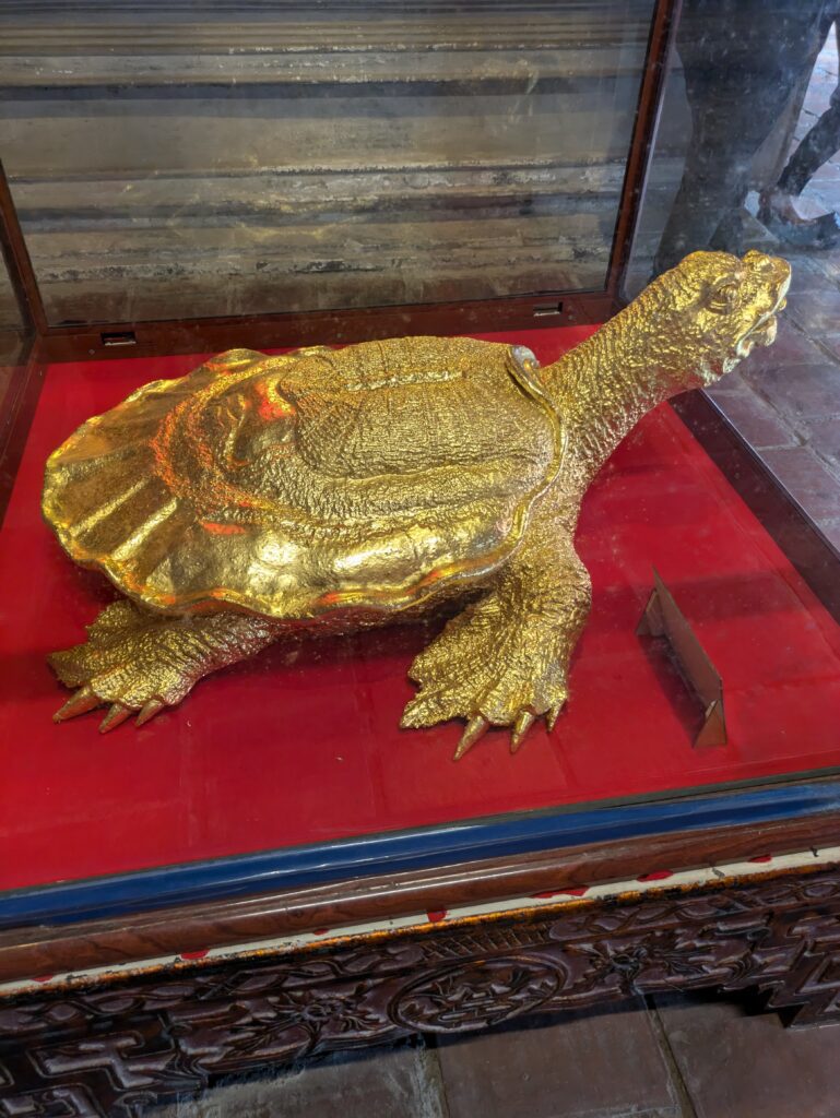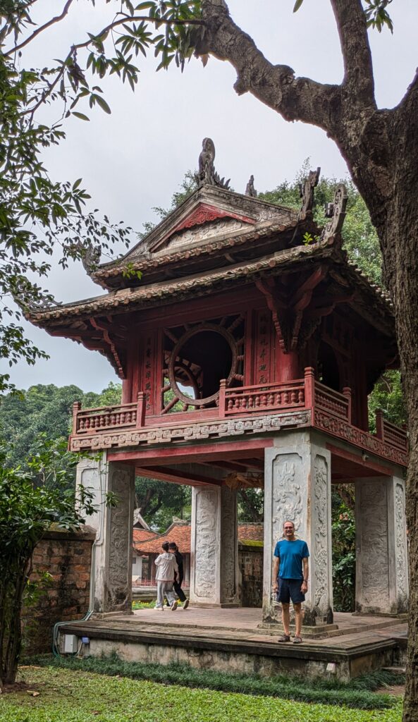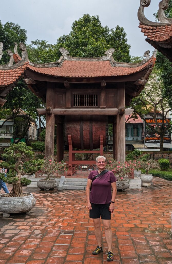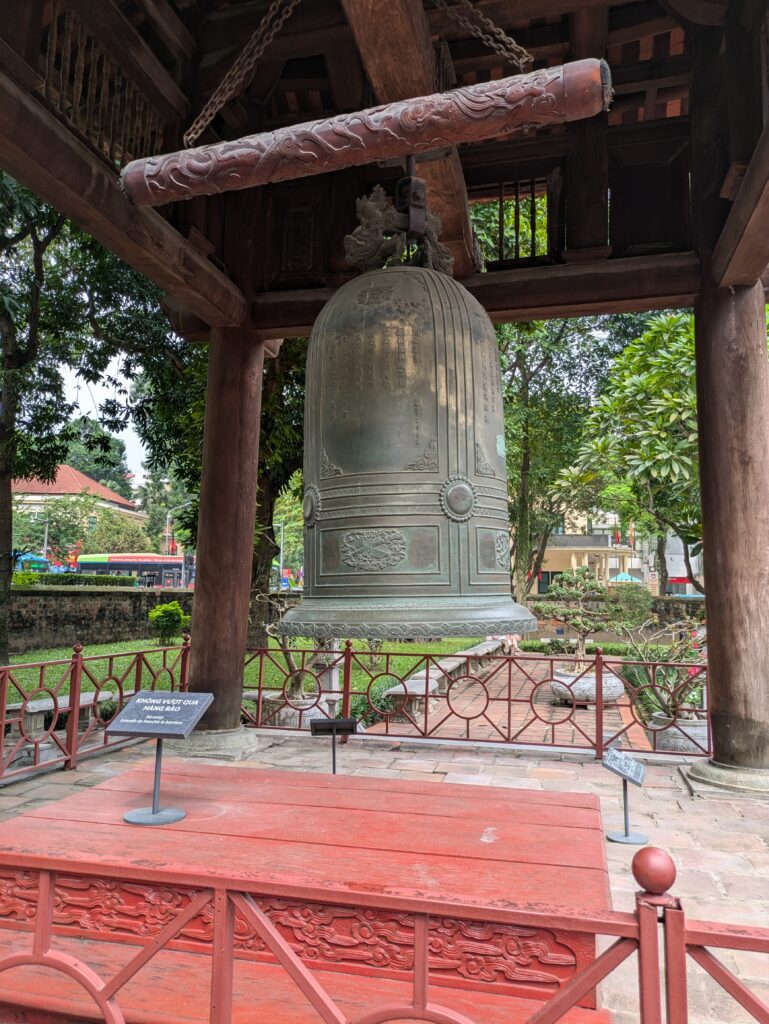 Now we went to the Temple of Literature – but more accurately should be called Temple of Confucius. We paid 70K Dong ($2.76) each, and enter through the main gate with many other tourists. The temple was established in 1070. We meander through courtyard after courtyard – total eventually of five courtyards. There is a great metal art sculpture in the second courtyard – where it is just metal pieces until you are standing at a certain place and it is clearly a man holding a pen, maybe Ho Chi Minh. As we left this courtyard for the third we pass through a pavillion, Khue Van Cac, which is recognized as the Icon for Hanoi. According to the placard,… “the beautiful Khue Van Cac is a symmetrical building that represents humility, clarity, and refinement.” I don’t know about that, but it is beautiful architecture. It was built in 1805 and it makes these this courtyard flow into the next. This third courtyard had Stone Stelae, which are engraved with “valuable historical resource for the study of philosphy history, culture, education, society, and sculpture in Vietnam. The Stelae were inscribed on UNESCO’s Memory of the World Registar in 2011.” Interesting fact, in 1960 these Stelae were protected during the war by being buried in sand and then surrounded by a concrete wall! Each sculpture of a Stela is carried by a turtle. There were quite a few other sculptures here; places of worship; a bell tower and a drum tower; a museum of sorts- to the King Ly Nhan Tong, who was the king right after this temple was built and was noted as “a brilliant, humanitarian, knowlegable king”. He had the first National University built here according to the placard.
