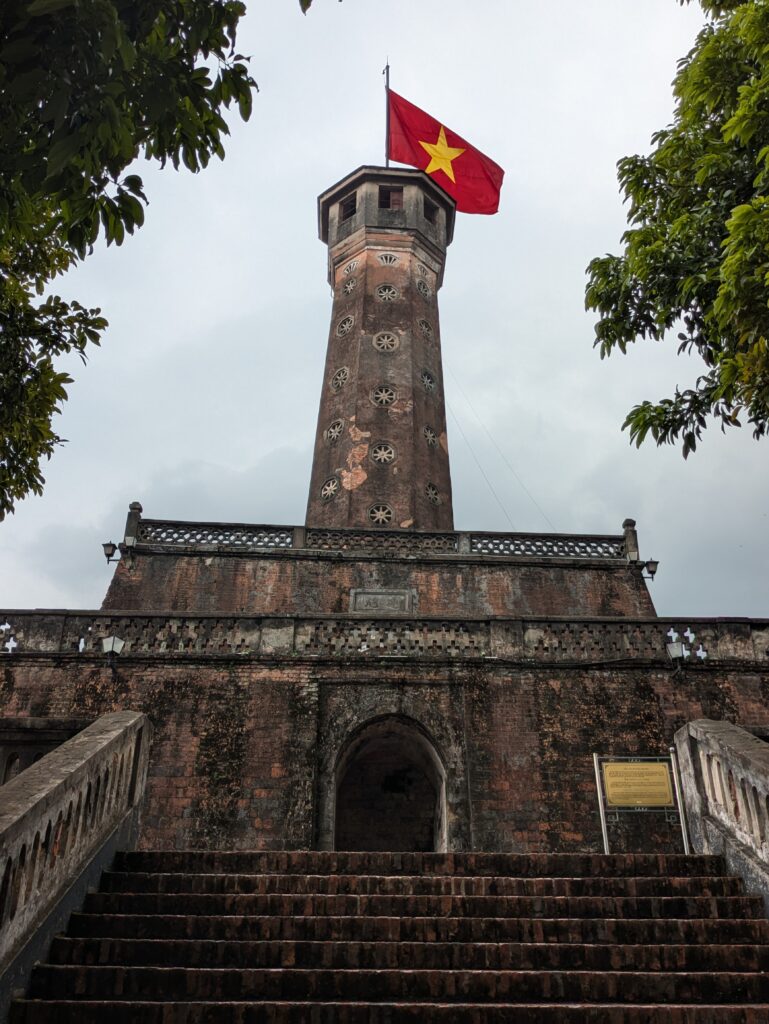 Next we walked to The Hanoi Flag Tower, built in 1805-1812. The placard states, “…overall height 33.4 m” (109.5 feet)…and “a national flag flies atop the tower day and night since Oct 10, 1954 to now”. The weather was pretty calm, but we finally had a slight breeze and I got a picture of the Vietnamese flag unfurling. You can not go inside the tower, so we moved on.