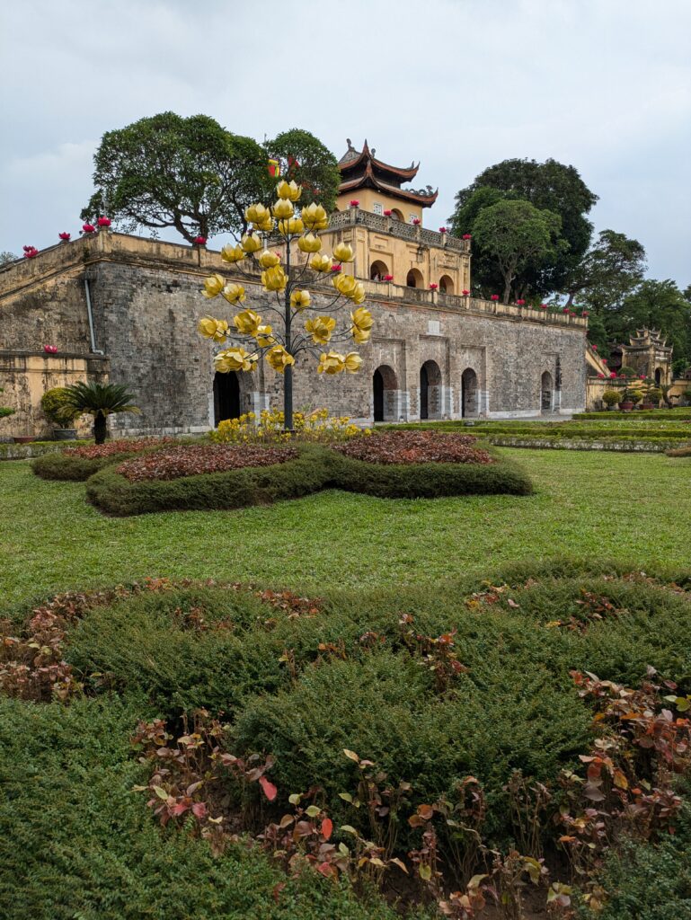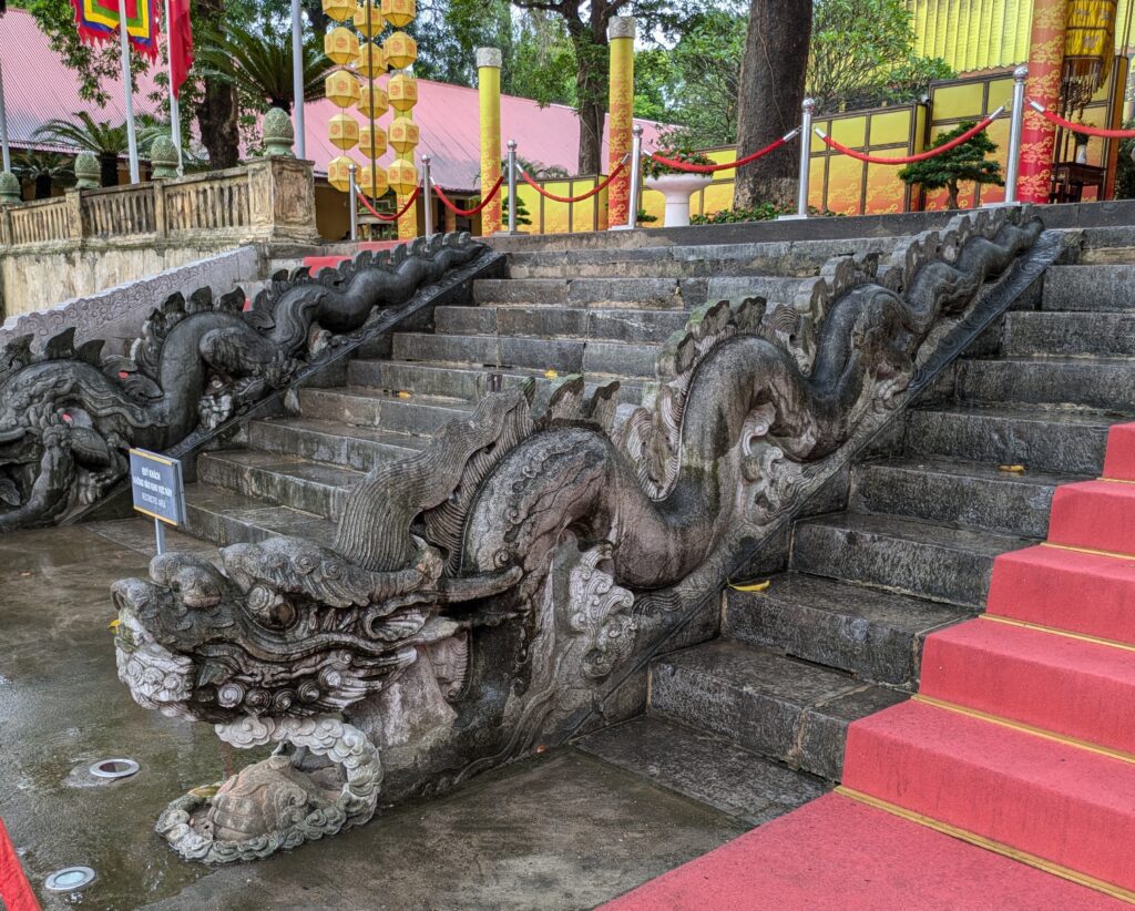 We head to the Citadel. As we approached we went the wrong way and did about 3/4 around it to the entrance– it is a big complex.. oh well, more steps, right?. We did pass by the North Gate of the complex – a placard states it was the only one of five gates to survive the Vietnam French War. (We also pass a Roman Catholic Church of Our Lady of Hanoi – Queen of Martyers. The outside of the church really popped against the sky.) Finally, we arrive at the entrance of The Imperial Citadel of Thang Long-Hanoi, we were directed across the street to buy tickets (which was false and we ended up getting a combo ticket for an archeological site… more on that later). Anyway, this place is a World heritage site, due to, “its longevity (more than 1,300 years); its continuous role as a seat of power; and the cultural layering seen in its archeological and built structures.” Also the placard mentions a citadel has been here since when Chinese administrators ruled and then later Vietnamese Emperors. Also it was the headquarters of North Vietnamese during the Vietnam War with America. We saw the East gate and the South Gate, which is the main entrance to what was the Forbidden City and where the Emperor’s palace was. Supposedly this “existing structure dayes from the early Le So dynasty (1428-1527), with restoration works during the Nguyen dynasty (1800’s- early 1900’s). It is two storied and we are allowed to climb up. There are all sorts of placards with history of differing dynasties relating to this gate along the way up. At the top, vistas were nice back to the Flag Tower. From the gate we meander through various small exhibitions of different archeological pieces found in the citadel. We also pass by the area that was the palace – all that remains is stone Dragon Steps. They are from 1467, according to the placard, and are roped off, but out in the elements and quite viewable. Anyway, there was quite a lot more here but that was the highlights, including the second part of the combo ticket – it was for an archeology site that was a wash, literally. The roofing is mostly holes and the site is all covered due to the rain nothing really to see except tarps.