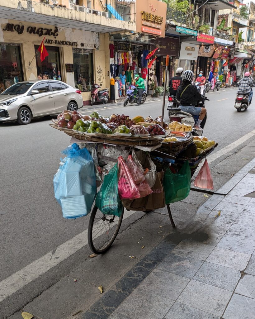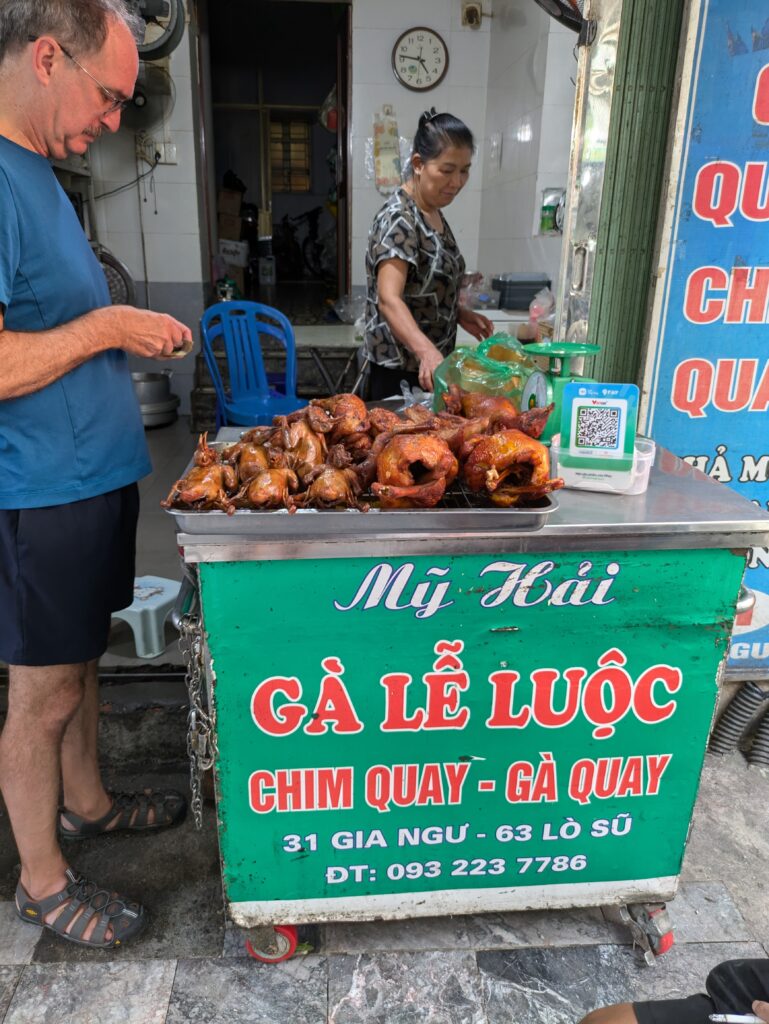 Back to our place I blogged Jeff read. Afternoon later was pleasant and we wondered out. We found the chicken place we had seen before. It is called My Hai and advertises – “Ga Le Luoc, Chim Quay- Ga Quay”, which translates as “Boiled chicken, Roasted bird – Roasted chicken.” The lady did not speak any English. We wanted two pieces of thigh/drumstick and pointed at them. She motioned cut up. Jeff said no (it will be easy to debone). Then she showed how much by holding up the bills of the amount. Jeff pulled that out (160k Dong=$6.44) and we left. Chicken in hand, we found some bread at a bakery (70k Dong=$2.82) and strawberries from a lady selling fruit from her bicycle turned cart (100k Dong=$4.03).