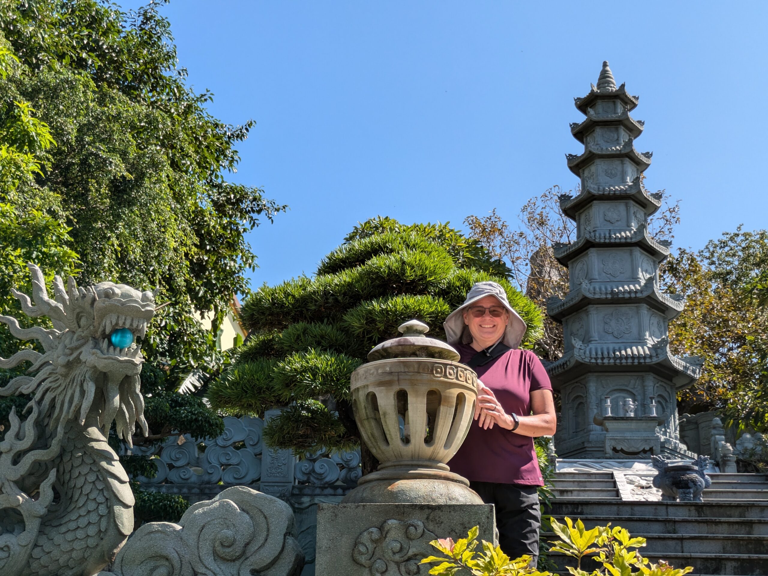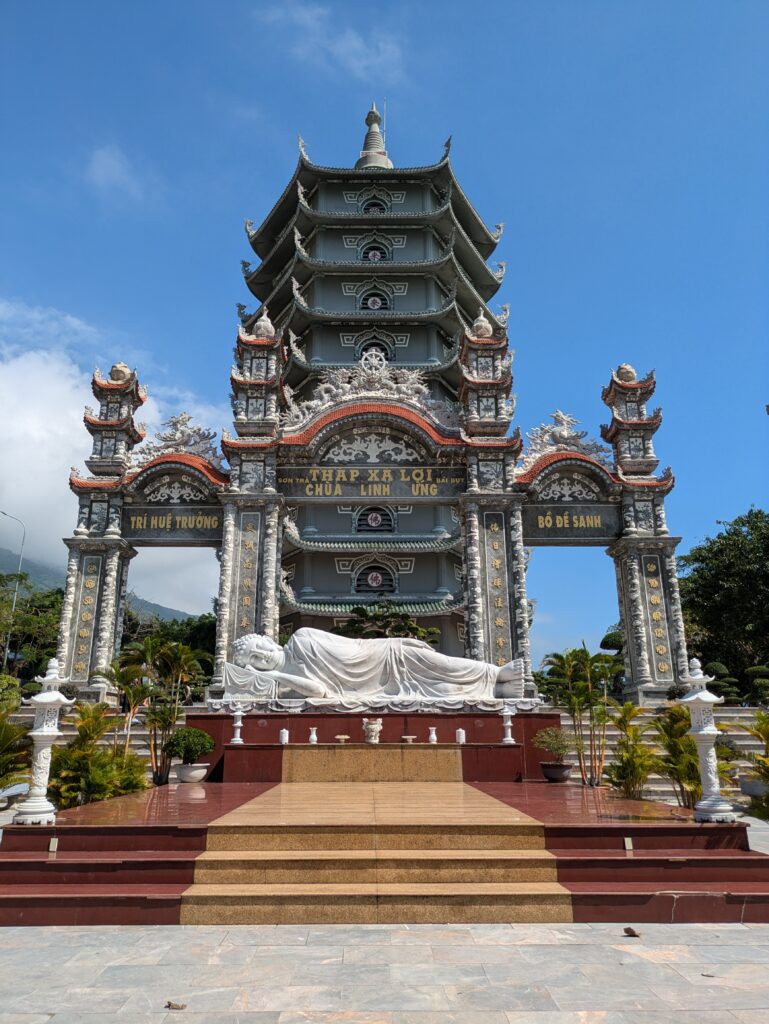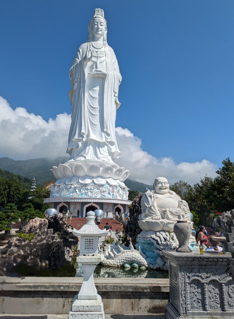 We set off on the scooter to go to a famous pass here, but it was a very hazy day. So, best laid plans… we changed and went to the Lady Buddha Site instead. We followed the “snakey” road, up the hill, seeing peeks of the white buddha statue contrasting with all the greenery of Vietnamese forestation. Arriving and finding the scooter parking, we went into the site – the whole site was free, even parking! We walked to the feet of the looming Lady Buddha, according to the web the “statue is a symbol of peace, joy & prosperity” and “is believed to help all living beings with her compassion and mercy.” I don’t know about all this, but she does soar 67m (220ft) above us, and that provided some nicely wanted shade. After we did our neck stretching looks, we did our photo op, and then just walked around the site. There was a nice little water pond area, garden-like park areas and several smaller temples to take in. The Statue was built from 2004 to 2010 along with the whole site here, that involves the Linh Ung Pagoda. It is also very tall and looming, but I could not find how tall it was. There was not any signage here about that, and I fell in a rabbit hole trying to find it online. Anyway, out front of this pagoda was a Reclining Buddha statue and a massive gate. You can not climb up inside the Lady Buddha statue or the Pagoda. That was a bit disappointing, because the views out over the shoreline of the ocean and Da Nang would be spectacular. Anyway, we wound up our tour of the site and loaded back up on the scooter going back down to the city of Da Nang and on to Hoi An.