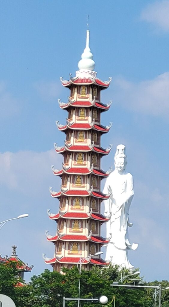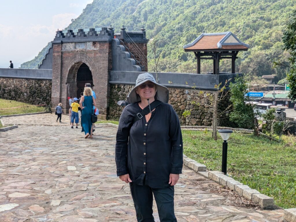 It took us around an hour to arrive at the pass, which is 490m altitude (1,608 feet). The area is very much touristed! Lots of people meandering about, with all manner of tourist shops & restaurants; and a few buses, cars and scooters. The area is situated in a lower area with two mountains rising up around it. The biggest mountain is the Hai Van mountain. But there is also the Hai Van Gate, which was a military defense fortress with bunkers, and has been such since at least the mid 1400’s AD. It was also used during the French-Vietnamese and American-Vietnamese wars, according to the placards. We walked about, mostly taking in the views back down to the ocean, and the snake of a road we took to get up here. Da Nang’s tall buildings can just be made out because of some haze still in the air. We could also see the train track below that we took a few days ago. We were finished looking around after 30 minutes, so we left and went back down toward the city. First we did stop at a cafe and had a drink, it is hot. I had a lemon ice tea, and Jeff a lemonade.