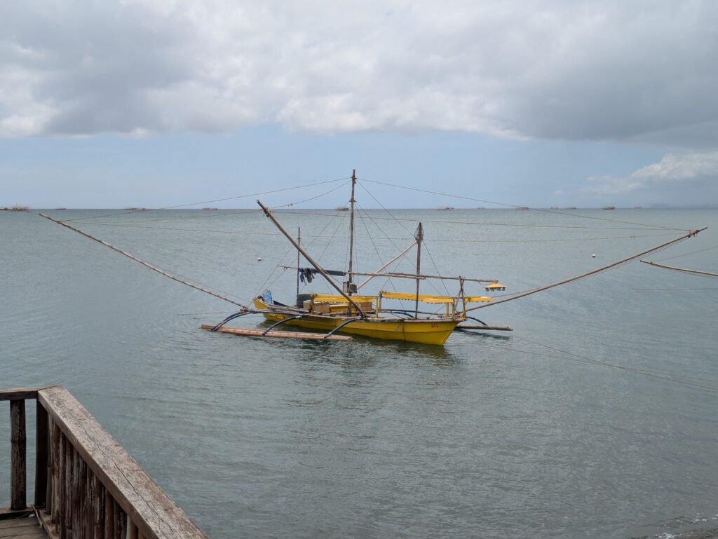 We stopped to get out of rain, yet again, at a resort cafe place called Poochie, Refreshing Drinks. I think we were their first customers of the day. Not quite hungry for lunch, we ordered a snack of potato”mojo’s,”which were sliced, battered potatoes, deep fried served with a sauce; and two shakes- one mango, one banana-langka (or jack-fruit). It was a nice way to get out of the rain. While we waited for our order, we took in local fishing boats. They were interesting, having one main mast that had ropes going out to four more masts/poles. We would have liked to have seen it in action. Our food came and we enjoyed watching the water and no more rain. The snack cost us 265 PHP ($4.64). We hit the road again.