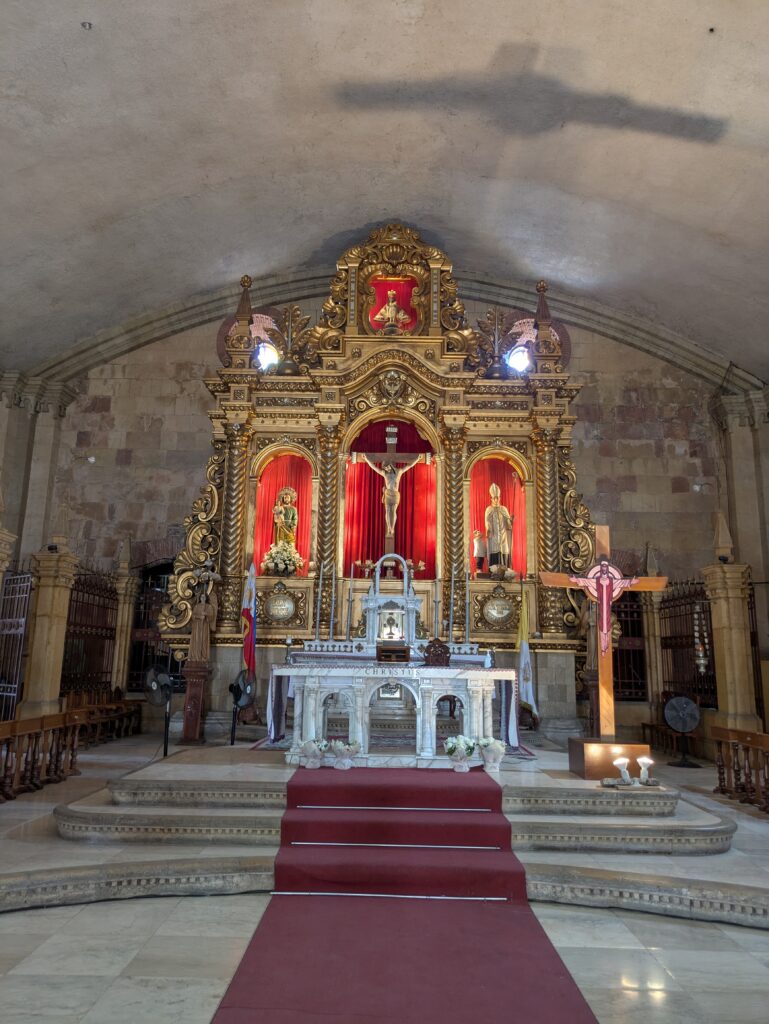 Now, describing the church… From the outside it is massive, with very thick limestone walls. There are two Bell Towers that flank the main structure with a very unique facade entry. The limestone has been carved with a Palm tree, Coconut trees and Papaya trees. There is also a man holding the Palm tree and supporting a baby (maybe, the baby Jesus); and a statue of St Thomas of Villanueva, I assume. It is a very ornate, grand, and impressive entryway. We went inside and a ceremony was happening, Christening a baby! A man at the entry took us aside The man did a brief explanatory to Jeff as I took pictures of the main altar. Then he took us in a side chapel. It was a baptismal font area. He positioned us and took photos of us with a statue of Mary and the baby Jesus. Then he had us put our hands on a wall in a particular position. Once we saw the pictures we saw the likeness of Christ in the stone with our hands framing it. Anyway, we thanked him and left, going up to the main alter, but the Christening was still ongoing. So we walked outside around the walls of the church/fortress. When we went back in the ceremony was done and we took a couple of pictures of the main marble altar with its gold gilded baroque framework behind. Stunning.