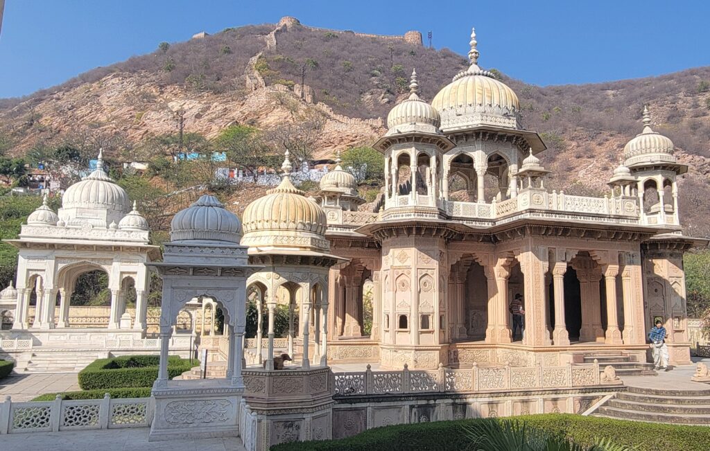 We arrive at Gaitore Ki Chhatriyan, as our first stop.This place is a bunch of pavilions with the cremated remains of the royal members of the Kachwaha. The morning light was great and every way you turned was a great picture. There were not any placards to describe the site. It was beautiful. Again they go all out for their dead. But as I write this I remember the Pyramids were burial places of Pharaohs, and Jerusalem has their big cemetery on the Mount of Olives. Hummm… Also there were monkeys, of course; parkettes and other birds, they were being feed oranges; the squirrel/chipmunks; and donkeys! We were there 30 minutes or so, until 1035.