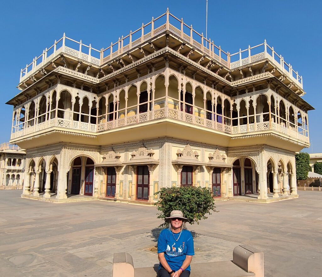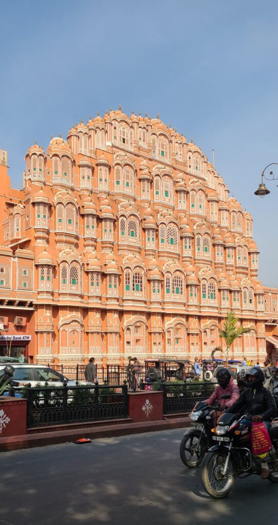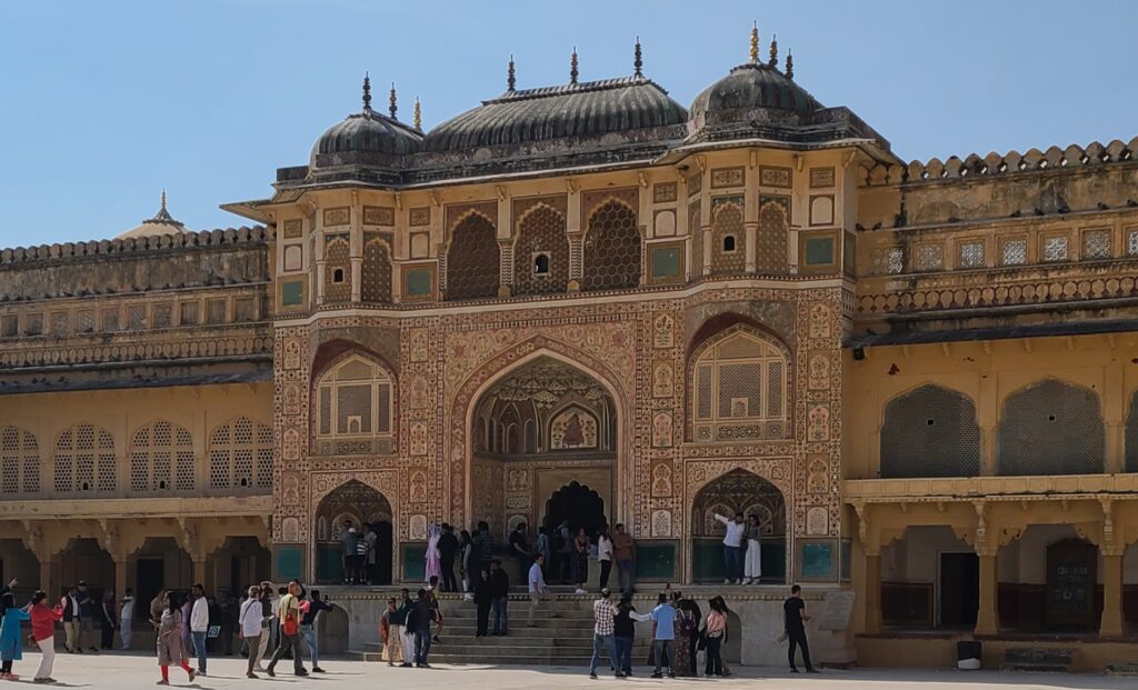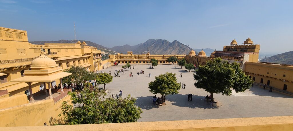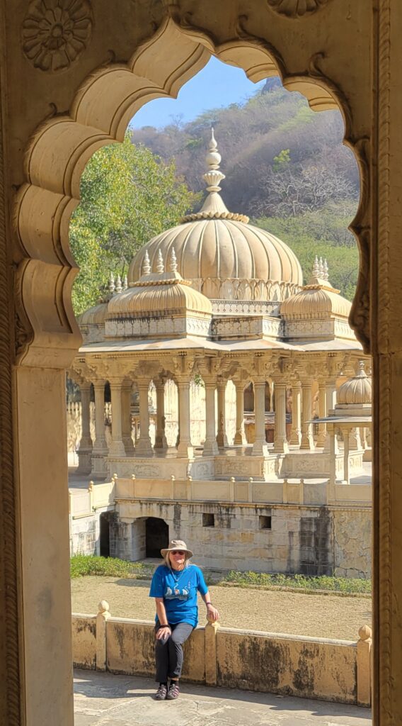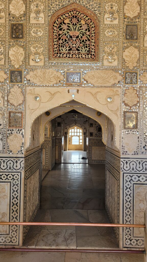 Next stop, Amber Fort/Palace. Stunning!! 😍 Great light here as well. The amber color stands out very well. The fort is situated up on a hill overlooking what remains of Maota Lake in front. (It collects rainwater as it runs off nearby hills and was the main source of the palace’s water.) All around on the other hills are walls, like the Great Wall in China. The walls serpentine up and down along ridges. They would have provided extra defense to the Fort/Palace. Anyway we climbed up some stairs and ramp/street to the fort. We saw elephants trekking up with tourists. We enter the Sun Gate. Now it becomes clear why it is sometimes called a fort or palace. The outside, definitely is a fort, but here, inside… Amber Palace is more fitting. Through the gate you enter a big square and just soak it in. Now we pay the entrance fee and go up a grand staircase into the palace area which opens up to another square area, but with majestic buildings and a garden. This is how everyone who came in the past to visit the King would have entered. The first building is the Diwan-i-Aam (Hall of Public Audience). It is an open roofed area of series of arches – outer ones are red sandstone and inner ones are marble. Next building is Palace of Raja Man Singh. Its front entry is embellished with magnificent frescos. The walls are also decorated with tiles of two shades of light blue and some cream colored ones. Then we enter a second square area and here is one of the main attractions of the whole Amber Palace, the Diwan-i-Khas. It is the Hall of Private Audience. Wow! It is inlaid with beautiful mirror glass – in the walls and in the ceiling – offset with patterned tile work! It still reflects images and light. It is gorgeous and very crowded for good reason. Now we just meander and ‘get lost’ so to speak. There are so many other rooms, and stairway areas. It is like a maze. We spent 2.5 hours here, from 11:00 to 1:30. We bought a Coke and Limca; found our driver, Fakru; and loaded up – onto a new place. Our driver is semi aggressive, and has driven the wrong way on the road – this still blows my mind even after two months of witnessing it!