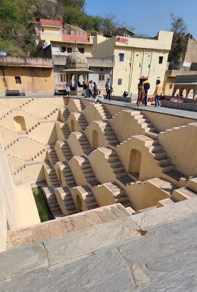 Anyway, we arrive now at Panna Meena Ka Kund. These maze of steps leading into a pool are quite prevalent. this one is painted cream yellow and makes them more noticeable than the black stone and just cement ones we have already seen. Also there is a bit of very green water at the bottom with turtles in it. A guard has been stationed at all of these pools to keep people from going in them, and they are not shy about blowing a whistle at you if you attempt a step in! Across the street from this is a ruin of a temple, Bihariji Temple. We walked about it and then back to our tuk-tuk and moving on.