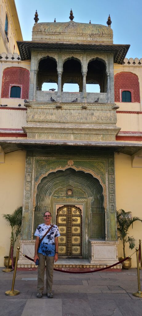 Now, we go to Jantar Mantar, which is the Astronomical Observatory. A Raja, Sawai Jai Singh, the patron of astronomy of his era in India, had it built in 1734. The “instruments” are huge – more like buildings! They are still accurate, and they were renovated in 1901. Finished we again go across the street to The City Palace. Again we enter through a gate to a big square. In the the center was a large two story building that was only partially open (first floor) with a tapestry exhibit. A man was painting on the outside, small detail work (like I saw the lady this morning at our hotel). Then through another gate opening onto another square, but this had the Palace. Beautifully painted and at least six stories tall. We went inside,but only saw the dining room, or multi-purpose room. We could not take pictures. The candelier was huge, but it complimented the large rectangular room. We were only allowed to explore here and we exited. There were other exhibits and shops, but could not explore up into the Palace itself. 🙁 One other building had huge golden pots and three dressed Sikh men they let me take a picture. They wanted to have me with them for a picture, but they would have wanted money, so I opted out. We left and back in our ride to one last place.