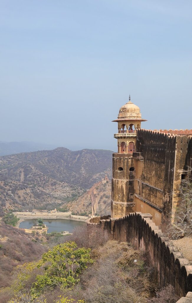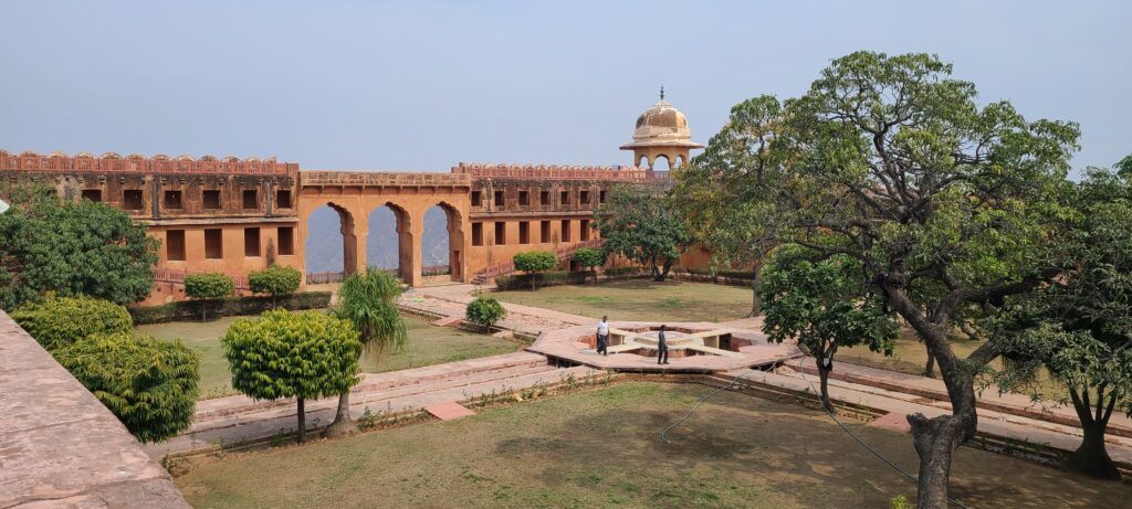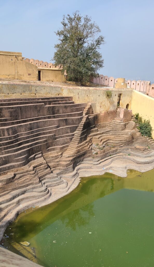 We get back on our scooter and go to our next place, passing through a couple more beautifully painted gates on the road. We arrive at Nahargarh Fort. Again, from the outside it is a fort, but inside a palace. We paid the entrance fee and scooter parking and go through an arched entry that opens to a courtyard with some painted walls of a double storied building, Shri Madhavendra Bhawan. It is supposedly ten apartments: one for the Maharaja- Sawai Madho Singh II; the other nine apartments were for his concubines. (We only counted nine total.) The apartments are all in different stages of repair with some open and a couple painted/restored nicely. Each apartment has a bedroom, verandah, kitchen/fireplace, and toilet. There is an inner passageway/corridor- Raja ka Galiyara, that connects all the apartments to the Maharaja’s apartment. Some of these apartments are being used by artists and have some of their works displayed behind locked window doors. Most were leaning toward modern art expressionism, not necessarily our thing. There was also a “Tank” here, which is the water collection pool for the palace; and also a neatly designed step-well, which was a water collection place, too. But the stepwell was built into and out of the mountain, unique design!