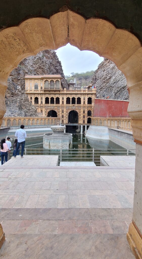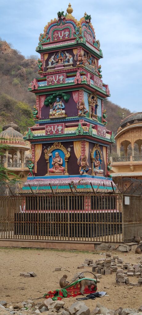 Lastly, we arrived at Mandir Thikana Galta, commonly referred to as Monkey Temple. It is situated in a narrow crevice of two hills. We paid the entrance fee and entered a complex of temples. The first temple was dedicated to the monkey god, but it was closed and locked. A man was laying on a ledge at the entry. When he saw us, he sat up explaining it to be the monkey temple… we went on. Next was a sacred water tank area that some ‘pilgrims’ were bathing in. Further on down, were more temples and, of course, monkeys. There are two kinds here – the red faced ones; and the black faced, lankier ones that we saw so many of in Hampi. The monkeys are more numerous and everywhere because there is food laid out for them everywhere. They were skittering all about. We descended further down into the other temple area and went into one of them. I took a few pictures. A Hindu Priest sitting there saw me and wanted to bless me with some paint for my forehead. I respectfully declined. We went out and decided we were finished exploring. We trekked back up, past all the cheeky monkeys, to our scooter.