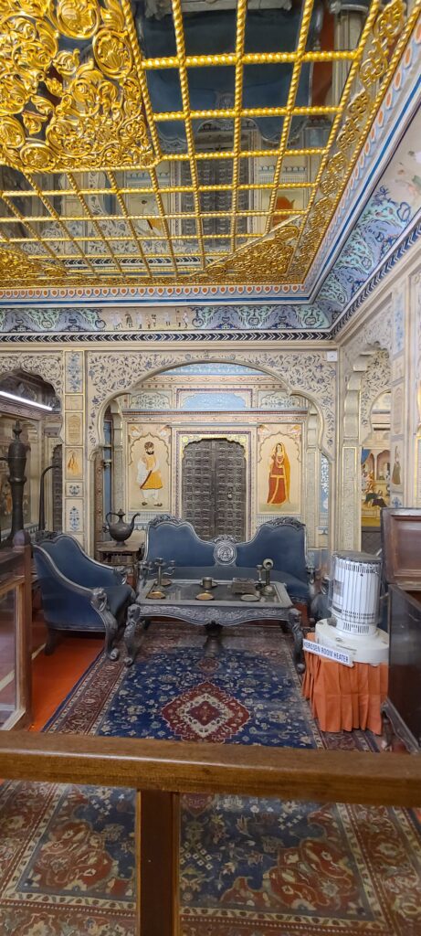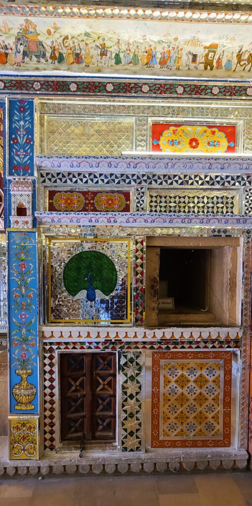 We went to Kotharis Patwa Haveli. It is a pay house, and it is the first of a lined street of these! They are so intricately decorated and just massive, with their fronts of 3, 4, and 5 stories. The street is almost mostly in shadow at noon, due to this sun blocking from these top heavy house fronts. The tops of the houses almost seem to kiss each other as they overhang their base floor structure. Anyway, we went in. This house entry is just over the top: multi-colored and mirrored, shiny, tiled walls, arches and ceiling. Next was the house private temple then directed to stairs that lead to an open courtyard with the house built surrounding it on four levels. Each level is balcony style with the same intricately carved balustrades and window coverings. Just a lot for the eyes to see and you to absorb, a definite display of wealth. Then we meandered through various rooms: dressing room, bedroom, kitchen, dining room, drawing room, and sitting room. They were all grand and had furniture and various items on display. Next, we are led up on the roof. Again great views with even some nicely carved unknown small rooms. Back down through the stories of the house to some set up side rooms with displays of Indian musical instruments, the Indian Postal System, and vintage cameras, toys owned by the house occupants. Lastly I’ll mention, there was an empty room with inlaid mother of pearl on the walls. Just beautiful. The wealth displayed here is incredible. These were not Kings, but wealthy merchants.