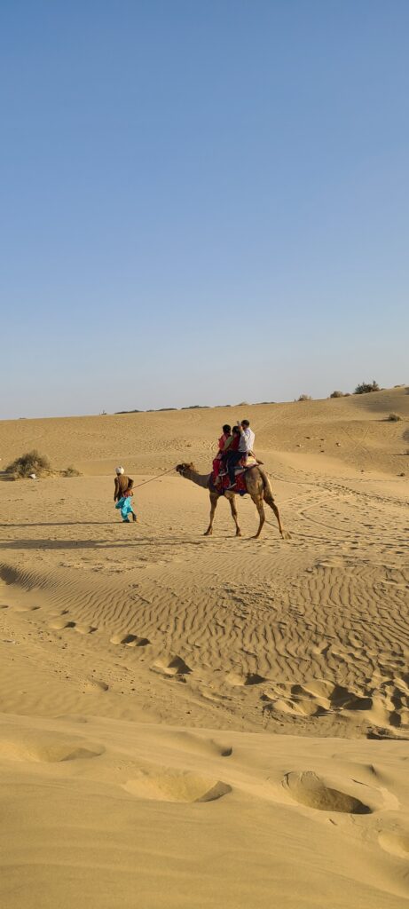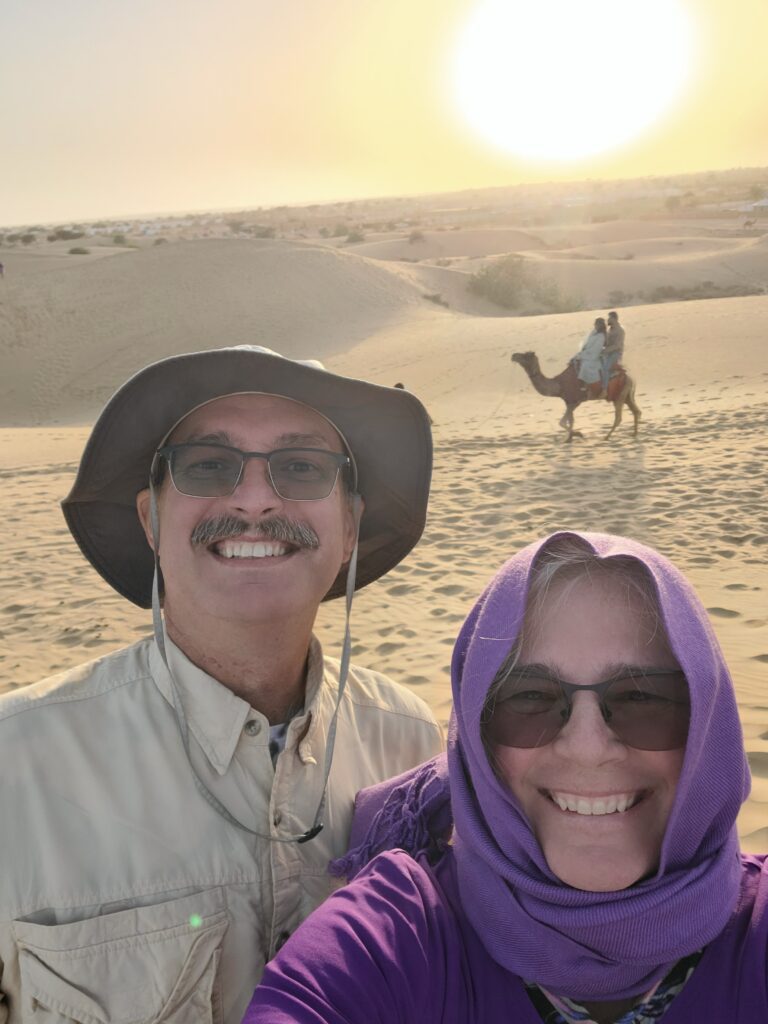 Around one pm, we went out thinking we would have time for a plate of momos. But we choose the wrong restaurant. They were working on takeout orders still after 40 minutes. All we had was my Coke. Jeff paid for that and we had to leave. Because we had to get to our desert safari place by two. We grabbed, on the way, a lunch of champions: three little bags of chips/things, and Jeff got a fresh pineapple juice. We arrived on time, but… had to wait for the other couple! (Could have waited for the momas, probably not, but was frustrating.) The on-time factor (or lack thereof) in India can be very, very frustrating. Anyway, they arrived and we were under way in an AC sedan, not the back of a bouncy Jeep. This is better for our aging anatomies!