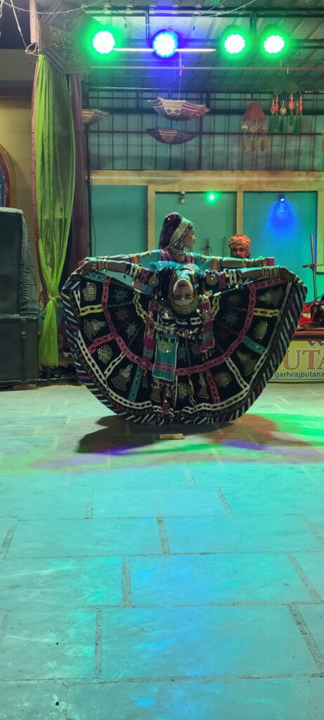 We were picked up and taken a little way to our resort/camp area, Garh Rajputana Desert Camp. We were let out and upon entering we were greeted with a drum welcome, and ‘blessed(?)’ with a red dot on our foreheads by a costumed local. We were one of the first let out and were just meandered a bit. As it filled in with some more people, a snack of fried chopped, breaded veggies and hot tea. Then the show started. It was four people – two men and two women. The men played drums, and a box accordian of sorts with one singing. The women were the dancers in bright sequined costume and sometimes did some beat addition to the music when they did not dance. Supper was served buffet style during this time. We had a mixed veg. curry; dal; some type of paneer curry (I think??); rice; roti; and a fried-breaded, not sweet coffee cake. It was pretty good. The show ended with mostly the men dancing to popular music. We found the other couple, they were ready to leave as we were, and found our driver. We loaded up and that ended our desert “safari” (more an excursion, which we were okay with).