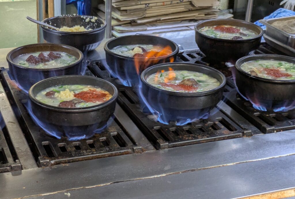 We found Jo Jeom Rye – Korea Food to eat brunch, at the old market here Nambu. This place does blood sausage. I have tried this before and did not like it, in fact, I hated it. But I tried it again as it is a Korean dish as it has been awhile. The young male waiter helped us immensely. We both had soups that had the blood sausage in it, but no offal or intestines. First all the Banchan or free side dishes came – a total of six – with two small bowls of rice. Next the soups came out, bubbling hot, one at a time. Again it was too much food, and well… very different. Overall, though, I am still not a fan of blood sausage, but it is the best version I have had. I could eat it, but I don’t need to have it anymore. I had a coke and Jeff had a beer. We finished what we could, paying 24,000 KRW or $16.79 and left.
