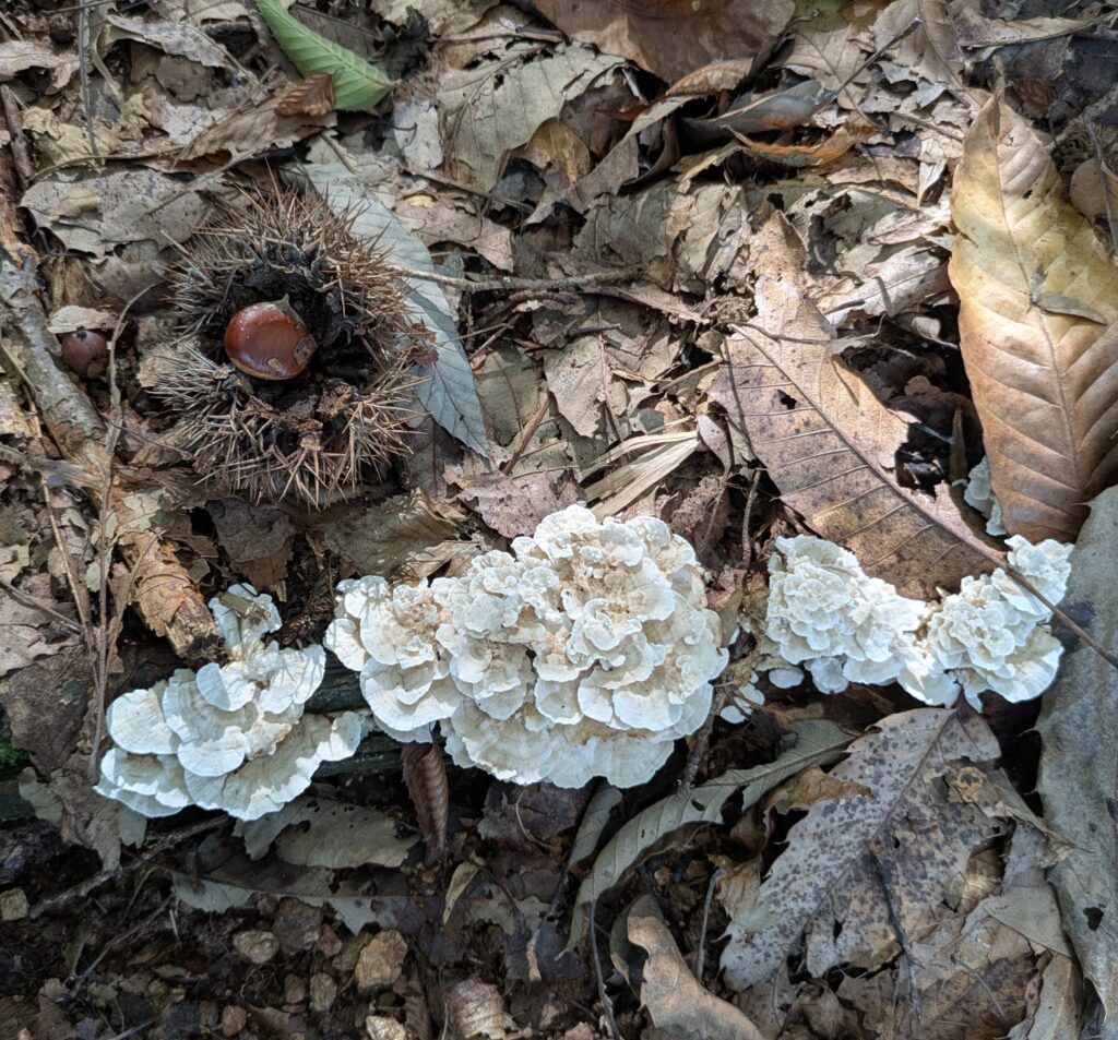 Around noon, we walked to a hill for a hike up and for a viewpoint over Jeonju. The hike was along a path carpeted with leaves – used enough to be visible, but not well trodden. There were many different bird calls and songs. We saw a couple of squirrels, and some butterflies. We also saw huge seedpods- one was opened and we realized they may have been chestnuts! Jeff will be looking for roasted chestnuts now. There were also different liken and mushrooms- maybe toadstools. Anyway, it was nice and a great way to work some of the bunch we had just consumed. The view didn’t work out so well due to trees obscuring it. But we were at 139.9 m 459 feet according to signage. There was a national geological marker in the ground that read 478 feet from 1884! Interesting!!🤔 Has the ground shifted 20 feet or is measuring more accurate??