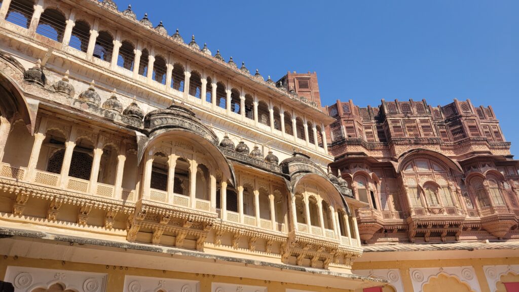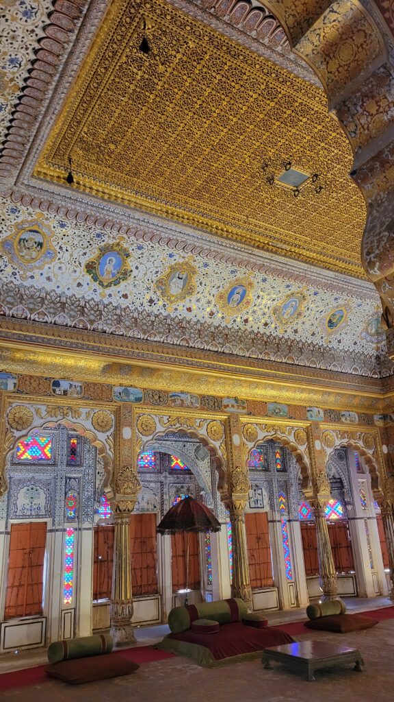 Next was the Jhanki Mahal, a colonnade space built in 1860, so the royal women could ‘witness events such as coronation ceremonies or royal assemblies taking place in the two courtyards below while themselves remaining hidden from public view.’ One could see out, but would not be seen. Displayed here were Jhulas, which are cradles or swings for infants. Then next, we were directed to the Moti Mahal, the Pearl Palace. ‘It is one of the oldest surviving period rooms in the fort’, and ‘was built in the 16th Century.’ It was also breathtakingly beautiful. One side is stained glass (not sure if that is original), but this adds interesting color to the room with its mirrored ceiling. The walls are white, color of pearl. As we exit we come to an inner courtyard that really shows off the great arches of this time period.