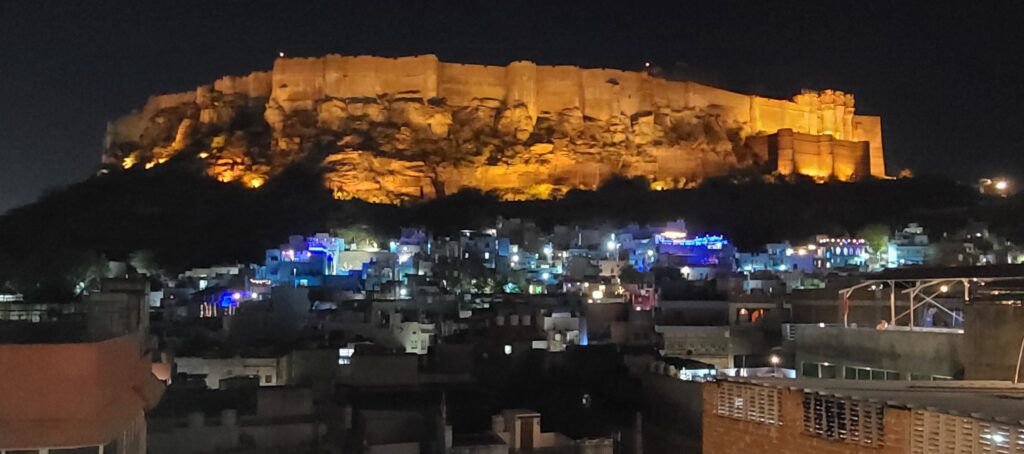 28 — Now today! Whew!! We got up and about. I felt great and hungry! BTW, Jeff’s bronchitis is substantially better – he finished his antibiotic this morning. His cough is better but still there. 🙁 We did a few hand washables of laundry and our resistance bands. Then went up on the roof for breakfast. We went up to the top – we did this last night, but I really saw it today!! This place has a fantastic view of Jodhpur! The city is laid out at the foot of the rocky up cropping that is the historic Mehrangarh Fort. Some of the buildings of the town have been painted hues of blue color. Almost a feeling of the blue city, Chefchaouen, Morocco. It is stunning, I am finally ready to explore. But I admit it is very noisy! Last night there were dogs fighting at all times; motorbikes (even a of couple Harley sounding ones); and tuk-tuks honking incessantly. But up here on the roof – right now, anyway, (nine-thirty-ish am 🙂 ), it is quiet, except for the chittering squirrel- chipmunks. The weather is sunny with a bit of “haze.” Anyway, we both had omelets: mine was masala with cheese and toast; Jeff’s was masala and toast. We split a pot of Masala Tea.