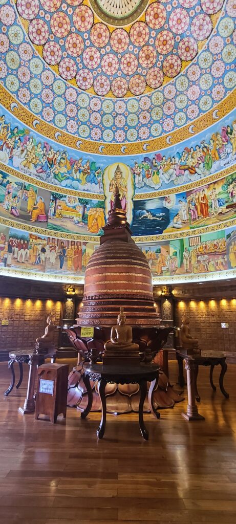 We started our tour going up, up, up to Asgiri Maha Seya. It is a large Buddhist temple complex. We had to doff our shoes. The first place Padeep – who is Buddhist – took us into was a large room with a large meditating Buddha, cloaked in a red robe. Next, we were taken to the large stupa. The outside wall is of 3-D panels of Buddha going about to locals teaching. The inside… well, it was gorgeous. You enter through large, carved wood doors. Then you are looking at a central small wooden stupa-type alter? Beautiful wood flooring and intricately carved wooden walls and panels with wood inlay, that are dramatically lit. There are Buddhas atop the inlay panels in meditating, teaching, and others sitting poses. Then the domed brightly painted ceiling, that is over the top, colorful – almost too much, a bit cartoonish. But Padeep said we could take pictures, so we’ll post one and see what you think. Third place of this complex was a Meditation Center room. It went into detail of how one is to meditate; the two kinds of Buddhist meditation; etc… too much detail for passersby, but if there to meditate, would be helpful the first few times, I image. Lastly the complex had a one room Museum. Padeep turned the lights on for us and we perused from 400’s AD to Kandy’s period that lasted 1480-1815. Kandy was Sir Lanka’s Capitol during this time, to the last King of Sri Lanka. Anyway, we finished and loaded up to the next site.