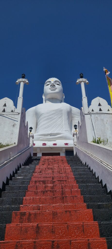 We go up some more to one of Kandy’s highest places, the Bahirawakanda Temple. Of course, we had to doff our shoes again. The stairs going up to the large sitting Buddha were painted red and black. It was a nice contrast to the white statue, but made for hot feet and some interesting fast hopping, running of stairs. (There were some carpet pieces on one side, but not on all of the stairs.)  Once up there is a large area to view Kandy. But there were also stairs (in shade) behind the statue that we also climbed. This gives a more elevated view of Kandy, but it is obstructed some by the Buddha statue itself! (We are supposed to be here for the Buddha statue, but all you see from this vantage point is the back of his head. The Kandy view is better🤭🤣!