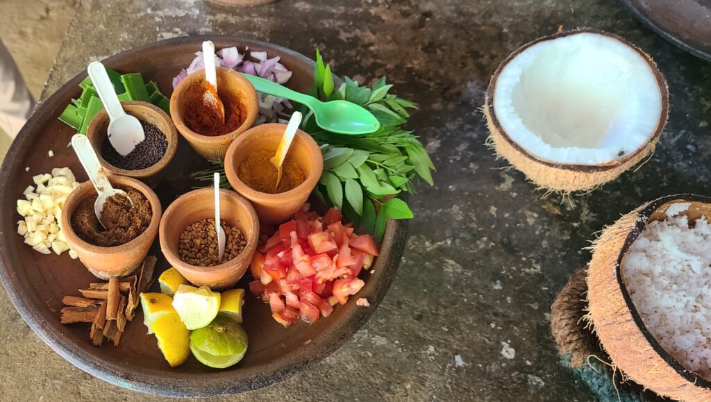Next we were taken to Kandy Spice Walk, 101. Here we were given a tour of spice trees and vines that are grown in Sri Lanka and  told of there uses in food as well as medicinal uses, while sipping a cup of tea given to us. I was even given a treatment to remove hair, that took ten minutes as we were toured through. Next we were taken to a table spot. My hair removal treatment was removed (I was not that impressed). We were given a demonstration of typical kitchen supplies in Sri Lanka, and how to shave out coconut flesh from the husk. Then a lady prepared a snack with that shaved coconut, adding ground/powdered chillies, red onions, tomatoes and squeeze of fresh lime. This was all mixed by her washed hand, placed in a small warm roti, and presented to us. It was great! We were given a flyer with three recipes and list of 25 uses of natural medicinal herbs that our guide had talked about. But next we were given a massage of our face (whole head for Jeff, but not me☹️ – hair factor, I think is why not me!); our neck; shoulders; back to upper hips; and our arms. (We had to doff our shirts right there in the kitchen area, kind of “caddywhompous” from another couple. That was surprising!) That was an awesome massage💯!!  After our massage (and putting shirts back on), we were taken to a shop to buy any products that we wanted. We did buy a small tonic that is supposed to decrease our sweating. If it works – GREAT! We tipped our masseuses and our guide, getting out while we still had money! I’m kidding, mostly. You could drop some serious dough in these places!!