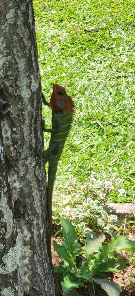 Now our driver took us to Saubagya, One Stop Super. It is a local Sri Lankan restaurant, grocery store, and a nursery to buy plants/trees. It was buzzing with activity in all three areas – it is Saturday. We ordered a rice curry with some scary looking chili topping (we scooped out about half on it to NOT eat); two breaded fried jack fruit ‘cutlet’ (more of a croquette); a string hopper; and a local honey millet cake-type square. We also had a watermelon juice and a mango juice. It was a nice assortment of Sri Lankan food for lunch. After we ate we did explore the produce store and the nursery. We saw a red-headed lizard here as well on a tree. We loaded up and moved onto our tour stop for the day.