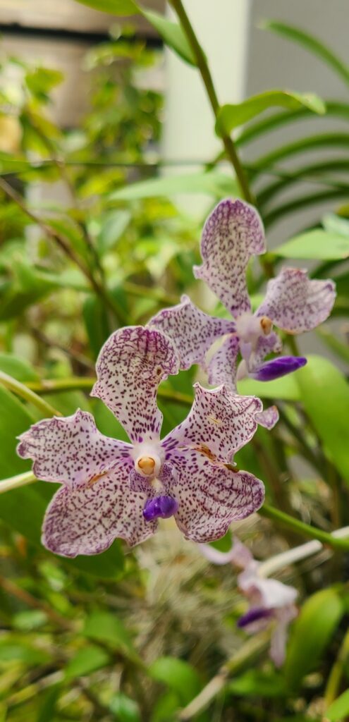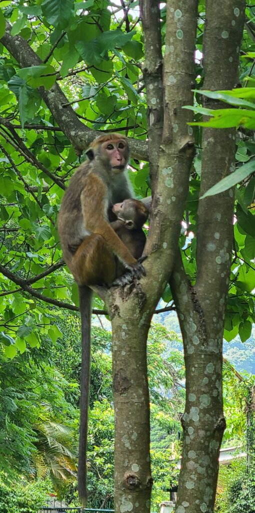 We left and moved on to the Royal Botanical Garden. Our entrance fee was 3,000 Rupees ($10)/ foreigner adult. It’s 200 Rupee (66 cents)/ local adult. This is one example of the mark ups for some places. Anyway, we did enjoy the gardens. We were given a three hour visit time, which we would normally have appreciated, and it was lovely, but it was also now the hottest part of the day– not so lovely! They had a great Orchid House. We always enjoy these. There are so many purple orchids on display here. A security guard at the entrance pointed out the Holy Ghost Orchid to us! It is also called the Dove Orchid. It looked like dove or an angel inside – pretty cool. Other areas: the Canarium Row of Giant Java Almond trees, with their buttressing roots; a couple of Palm Lanes – Royal Palm Lane and Double Coconut Palm Lane; a Cactus House; a Spice Garden; a river walk area where we saw two cows tied up? (Questions??), roosting Flying Fox Bats, and our first Sri Lankan monkeys;  some huge trees (Ceylon Ironwood – Sri Lanka’s national tree, Java Fig, Jack Fruit and Sausage trees) and some beautiful flowering trees (Pink Trumpet Tree – which was a picture from yesterday’s blog, Flame Tree- a brilliantly-aflame-orange, donated by New Zealand, and Pride of Burma – with dainty salmon orchid-like flowers; and lastly, the Blue Water Lily – the Sri Lankan national flower. If it would have been morning or a cooler day we would have really, really marveled at this Botanical Garden. But we were now zapped of energy, due to the heat. We bought a 7up 300ml and a 750ml water and downed them. We exited the gardens and called for Padeep to pick us up 15 minutes early! He was 10 minutes away. When he did show up. we nixed the last item of our tour agenda. It was a Kandy/Sri Lanka Folk Dance show. We have seen mixed reviews on these and we were too tired, so opted out.