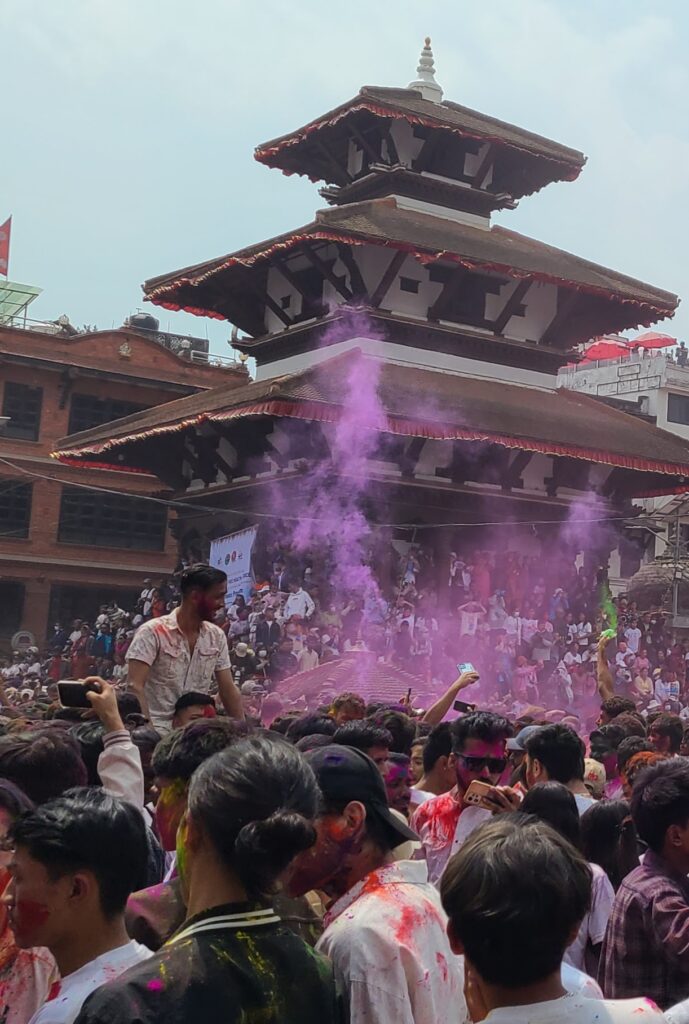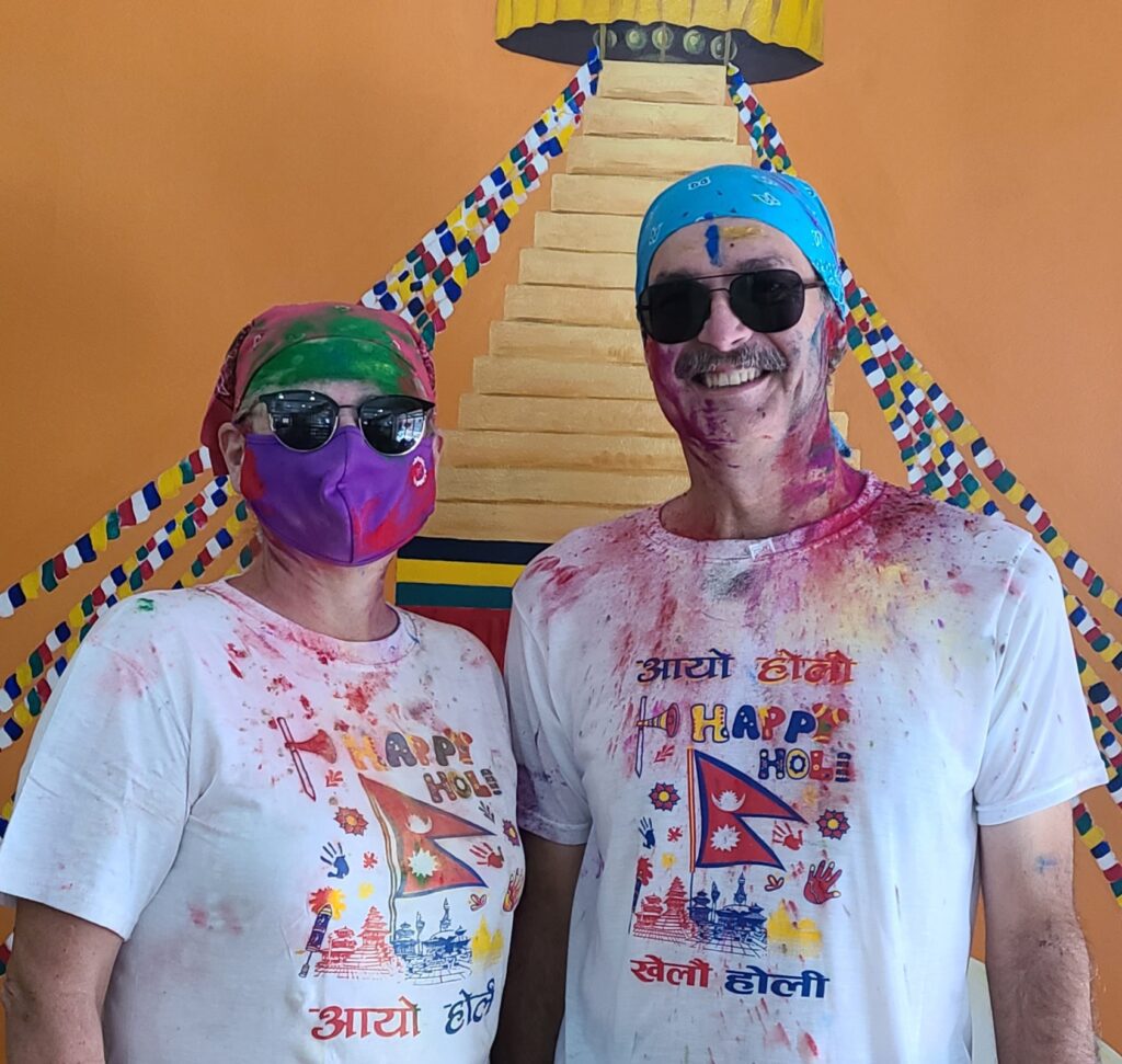 Finally, we arrive at the main temple area (at the big open square). From a distance, we see the ‘twentysomethings’ dancing/jumping to music, and throwing of powder all around in the air. The young people have really taken over this part of the holiday!! Also, I will say here, tourists add to the frenzy! Many of the tourists are worse than the native Nepalese with the powder paint. We did not buy any paint, but we did go out into it, so I guess we added some to the crowds, obviously. I am wearing my face mask, Jeff opted not to wear his. But Wow! Quite a festival, even as we kept our distance from the main revelry. This is something to experience. I don’t know that I need to participate ever again, but it is just something you may try to see once.