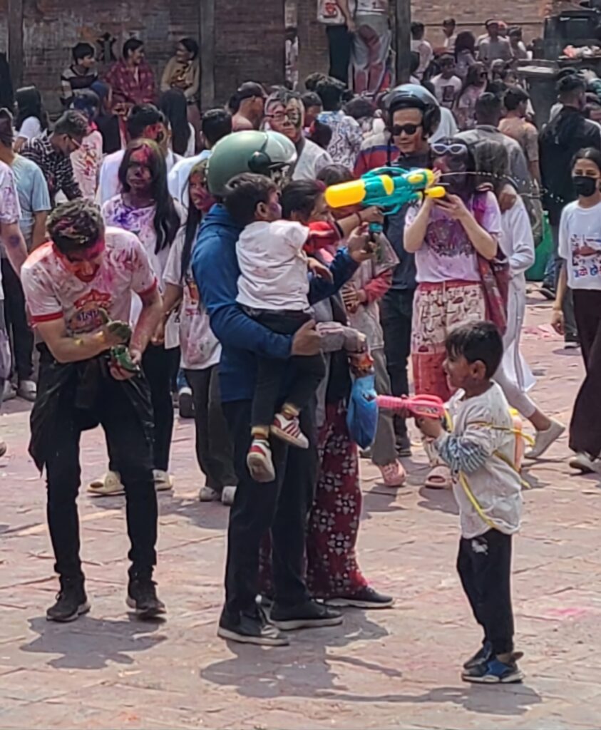 Up the streets, toward a main temple area, the crowds become more pronounced and loud, some shouting, “Happy Holi.” Then they would place some paint they had on our cheeks and foreheads. The young people, being more exuberant, seem to be the ones doing this more. They are also the ones throwing the powder. The really young kids, around ten to fifteen throw water balloons, some with paint colored water. Kids younger (around three to eight) have water guns🔫. Anyway, it is a gauntlet almost.