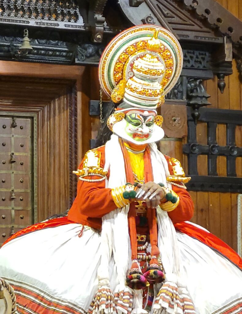 Around 430 pm we went back out. Jeff arranged through our homestay hostess a Kerala Kathakali Theatre. The performance starts a six, but at five the performers come and paint their faces on stage for all to see. For me it was as entertaining as the story. It took one hour for them to “do” themselves up. But the ‘bad’ character had to have help for some of his painting, and a “linen build up” on his jawline (I don’t know what it was called or what it symbolized, but it was a lot of work!) We are given a two sided paper that tells of the drama we will see and tells of the characters. A narrator introduced some nuances as a performer acted them out, because the play is non-verbal. The narrator also sings and plays a small accordian-type box, and a small symbol. There were also two drummers.
