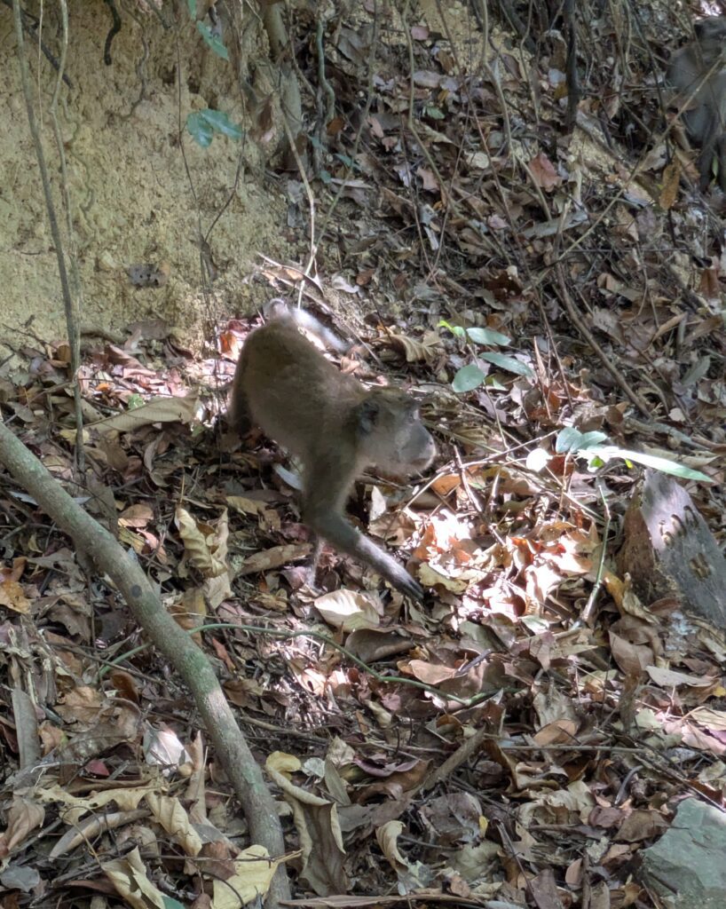 Now we went off of the lighthouse “island” and the beachfront area. We went to the horseshoe-shape trail hike. Another placard said it was 2,010 m long (6,594 feet, or a mile and two tenths) and it wonders through the tropical rain forest with its biodiversity of forest plants and maybe some wildlife. The hike was not that difficult (but steep) – many big steps around roots at first, then became a stone work pathway, with more big steps about 1/5 of the way in. It was steady busy with people, but despite this we did see more monkeys – “beggars”- eyeing for handouts or a bag to snatch. We also saw some old growth trees identified by signs. We heard rustling that could have been lizards, but didn’t see any. Definitely we heard and saw birds the whole hike. It was a good hike, but it was very hot and humid.