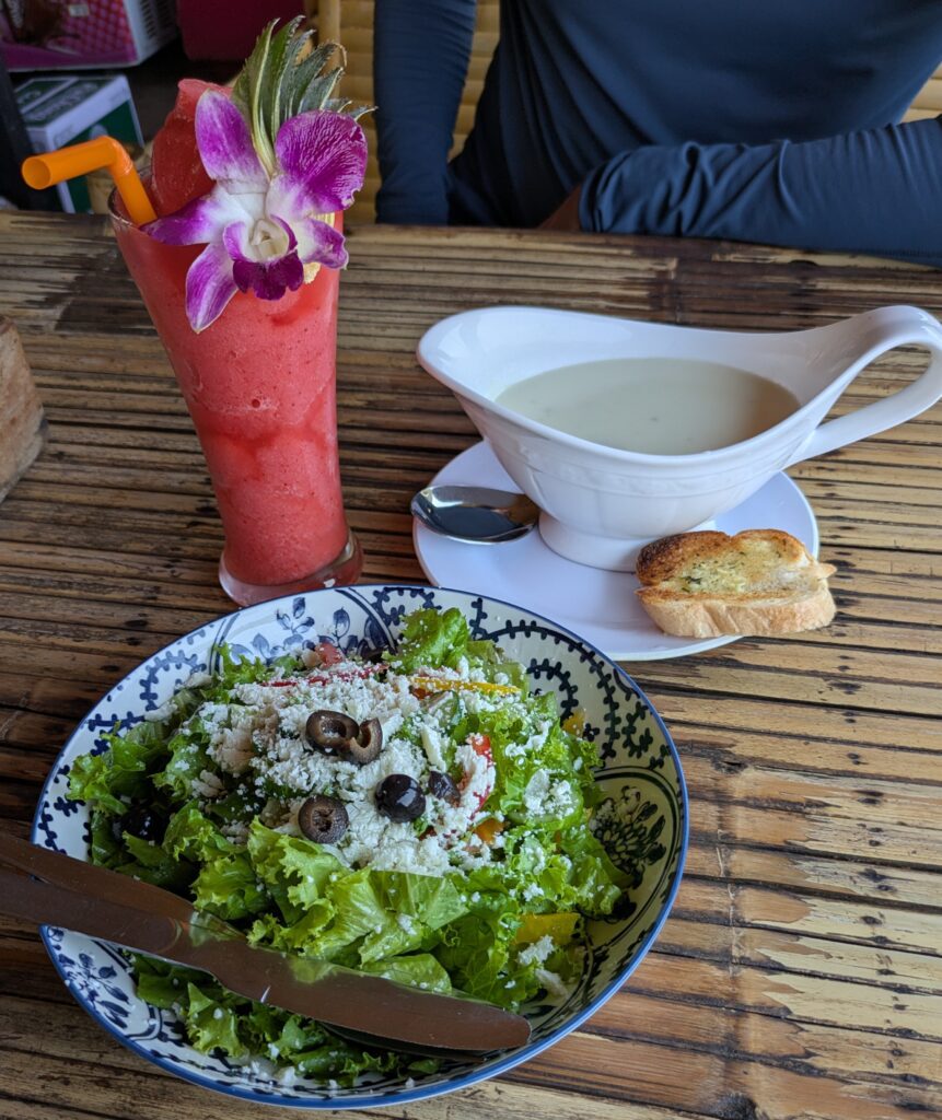 We drove out and stopped for light lunch at Sam Pinong Family Seafood Restaurant. We sat a table with great views of a beach just out of National park area. We had mushroom soup, and a Greek salad, with a large – much needed – water. I also a strawberry shake and Jeff had a Sprite. It cost us 400 Baht ($11.87).