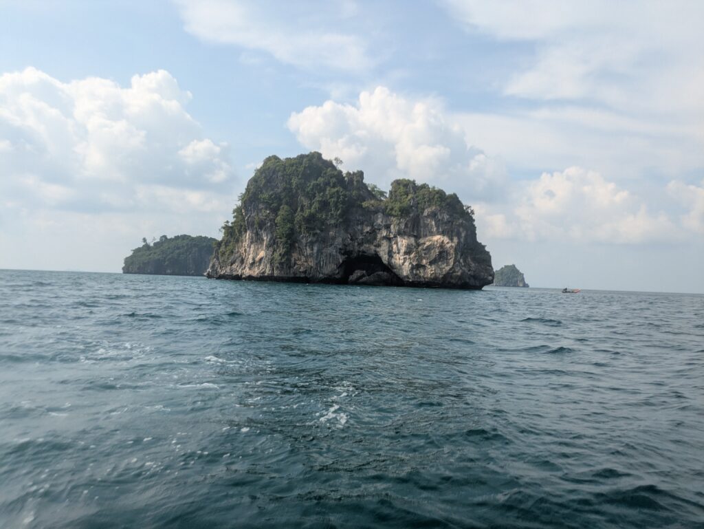 It is a glorious day, but like I mentioned choppy for a Jet Ski in the ocean. It does not seem so when I just look out across the beautiful water, but then we hit a wave, and crash down. Thankfully the Jet Ski does have great hand holds for a passenger and an awesome cushioned seat. Jeff did a great job driving “The Beast” – it’s name (LOL)! They are noisy-loud. As we are leaving the Five Island area and going to our next area, you can just make out mainland Thailand in the distance. That’s cool!