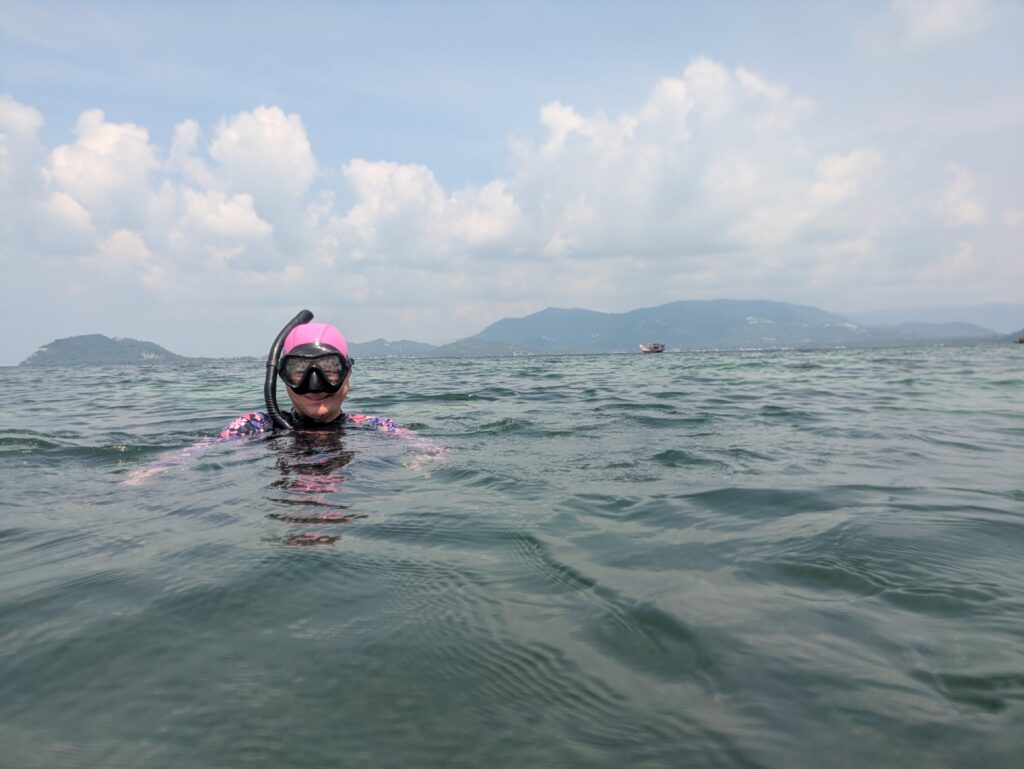 We started out right at 1000 and zoom through our protected bay area. The water is smooth and it is great to see shoreline we have not seen. Then we went out of the protection of the bay… and it’s well, rough on that Jet Ski. I will not deny it. We still enjoyed it but at times I felt like I was on a bucking bronco! (horse emoji??) Anyway, we arrive to Five Island area, which is Mu Ko Ang Thong National Park. These islands remind me of the Ha Long Bay islands. They jut right out of the water and seem Karst-like. Kai leads us around the islands some and takes our pictures. I attempted to take some also. We did not get off and visit any of these islands though. With it being a national park, it may have involved an entrance fee?? I don’t know. We take off and zoom on.