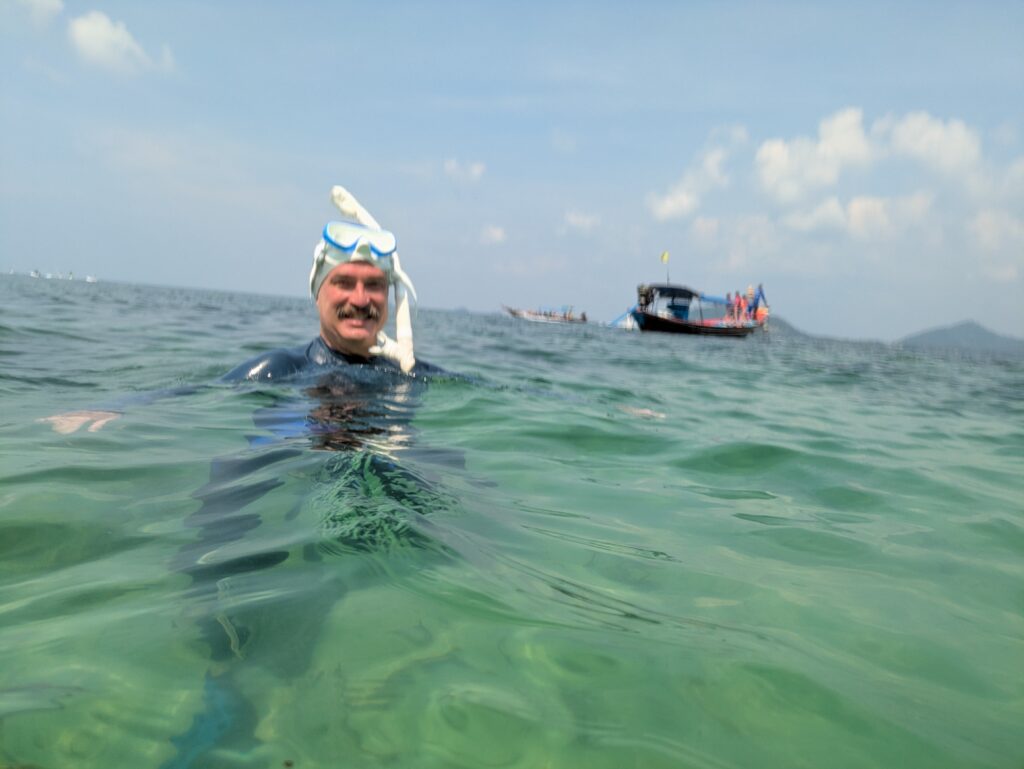 We arrive at Koh Tan, Google maps shows it as Tean Island. Anyway, Kai leads us up to the shore and we unload at a resort type area. As we walk in, Kai says lunch time. It’s 1040! We should not have had breakfast!!! So we sat and by 1100 we had a huge spread laid out in front of us– one dish at a time. First a platter of watermelon & pineapple. Next a platter of stir-fried rice with bits of eggs and veggies. Then a dish of sauteed vegetables – cabbage, carrots, onions, bok choy, and baby corn. And then a platter of crispy chopped chicken. But wait one more dish – the soup! It was a Tom Yum(?) with chicken. The food was so great and flavorful. I wish I had been more hungry. We left enough food that two more people could have eaten and had their fill as well. When we finished, we did some photo ops and then loaded up on The Beast and went just a small distance along the same island to a nice beach area.
