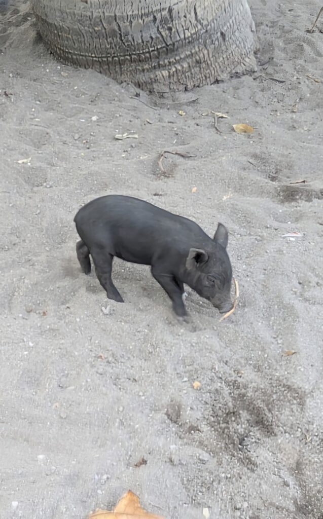 We arrived at Koh Mud Sum. The place is packed with Long Tail boats and Jet Skis. We squeezed in to unload and then Kai put our crafts on an anchor. Kai walked us to the area where everyone was, telling us there is a 50 Baht ($1.47)each, charge to be on the island. He also called it Pig Island. After we paid our “cover-charge” we spied the pigs. There were a bunch, all sizes from small piglets to huge sows! They were all camped mostly in one area, just behind the big restaurant, squealing and rooting. A few itinerant pigs were on the beach. Of course this is where many tourists were… with some of them squealing. I took a few pictures from the peripheral of the mass. It was not a frenzy, but some people were trying to pick up the piglets, and a lot of them were in the middle of the pig bunch to get Instagram shots. We meandered along a beach and found a trail that cut to an almost isolated beach and walked it for a bit. There were some shells over here and palm to football sized pieces of broken coral all along the beach. We went back to where everyone else was. Then I noticed some dogs also roaming about. It humored me – the island should be called hogs and dogs. (LOL)