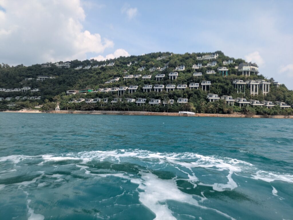 We found Kai and he gathered our Jet Ski. We now set back across the ocean waves to get back to Koh Samui. We took in more of the resort areas as we were zooming toward them. We could see the big five star one. It is bungalows on stilts “walking-up” the side of a mountain. We arrived back and thanked Kai – Jeff gave him a 250 Baht ($7.34) tip. What an adventure!
