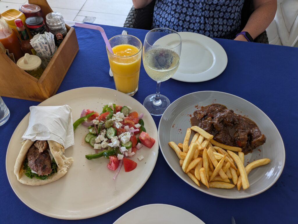 Around 1730, we went for a stroll on the beach and took in a sunset. There were definitely less people, but still touristy. Actually, we saw a couple in beach wedding attire getting pictures. That was different. We don’t know if they were engagement or wedding pics. We returned to our place and had supper, making our own Greek Salad and having some sourdough bread. Then we talked with my mom on a WhatsApp video call, and plan on doing Zoom with our church from back home.