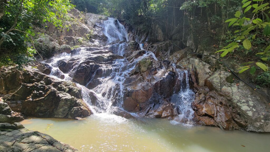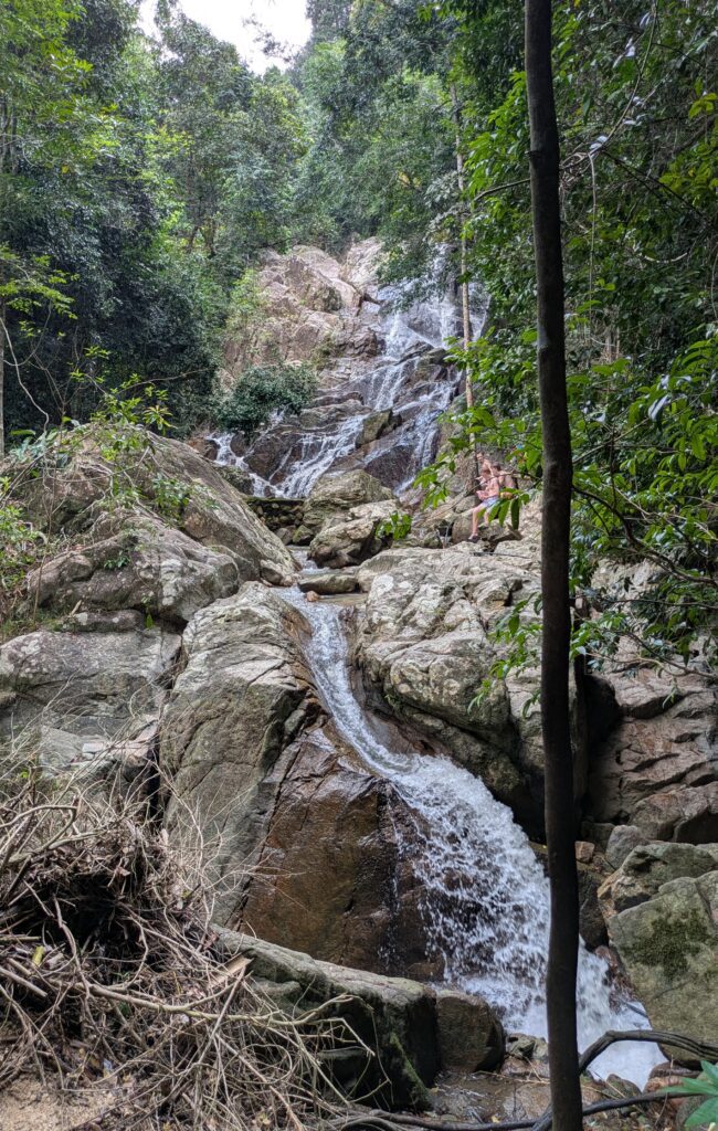 We made to a marker labeling Wang Born Fall and then in 230 meters was Wang Fang. (Nothing mentioned of Hin Lat.) But we could not see this fall as the stream was obscured from the pathway by the thick-treed forest. We decided to continue anyway. We arrived at the Wang Fang Fall area. We were able to see this waterfall a tiny bit more in a small view area, but there was another sign for yet another Wang…something-or-another fall. Still nothing about the Hin Lat Waterfall. So Jeff looked up the Hin Lat Waterfall reviews. They were not great, so we decided at this point, to call it and went back down. We did stop at one of the cafes we had past at the start of the hike. We split a coconut drink right out of the coconut. It hit the spot as we were all hot and sweaty.