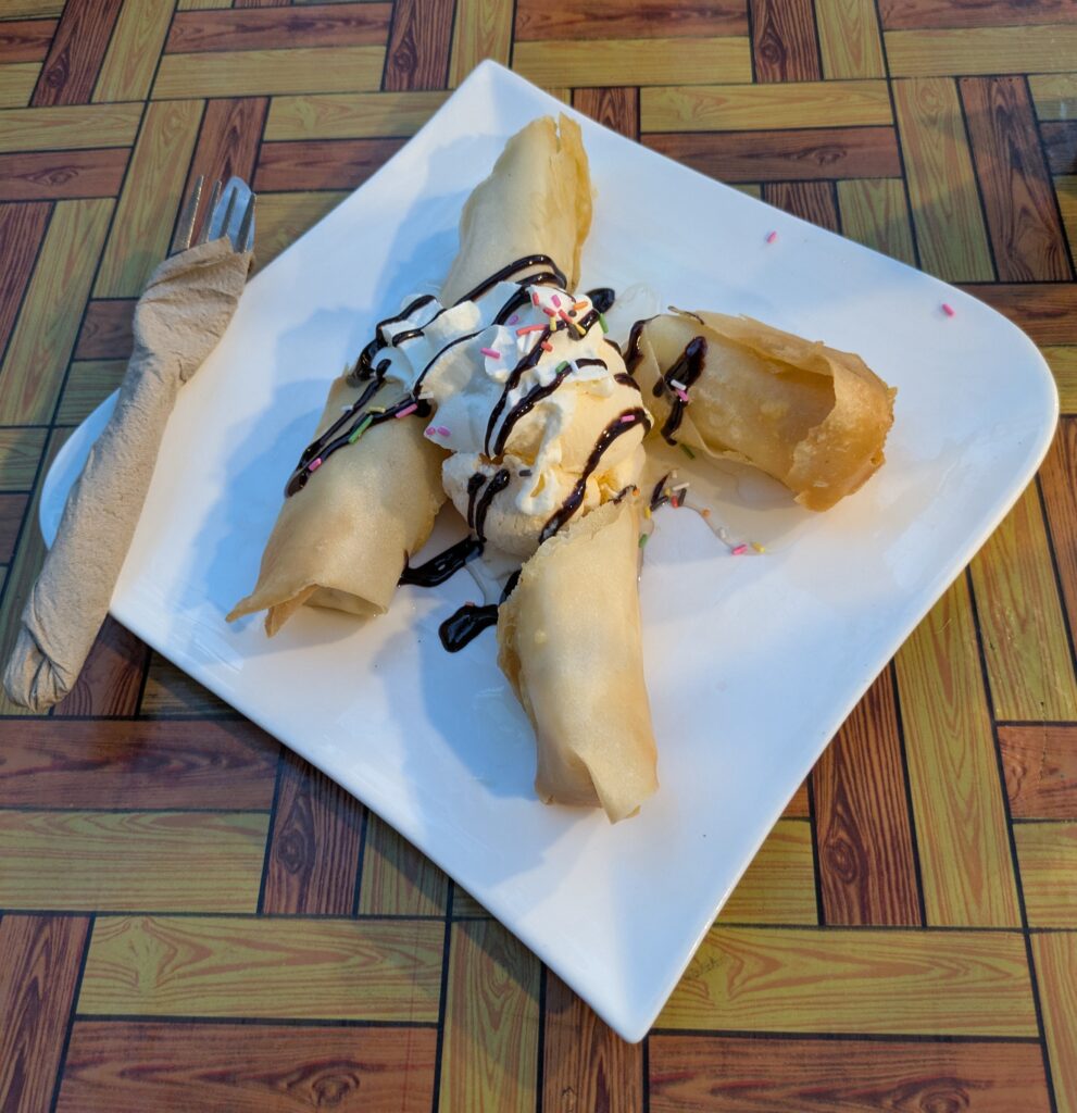 Afternoon was listening to Worship 24-7. The weather cleared some, at least no more rain, but we hunkered in because it looked like rain anytime. Around 1700 we hopped on Little Honda. We arrived at Think Retro Cafe at 1715. We ordered an appetizer of Fried Spring Rolls with Plum Sauce; Steamed White Snapper with Lime, Garlic, and Chili Sauce. We had drinks: me a long island iced tea, and Jeff a beer. We listened to the live music and enjoyed. When we finished we were wanting a dessert. So we had a “Pineapple Fritter” – which was pineapple wedges in a filo, deep-fried and served with a scoop of vanilla ice cream. We paid 987 Baht – Jeff gave 1,000 Baht ($28.93). On our way out I gave the live performer 50 Baht tip.