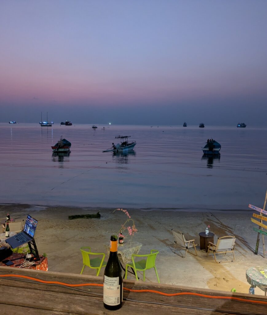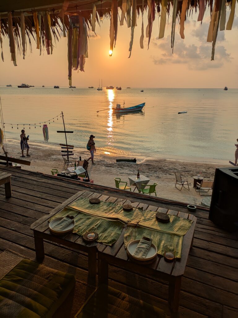 We had a spread: Local Sashimi; Local “Chili Paste- a kind of kimchi that Thai people use as dipping sauce for veggies…a palate cleanser”; Southern Thai Fish Curry; Local Vegetable Stir-fry, which was Thai spinach in oyster sauce with small bits of meat; Deep-fried Local Fish Fillet (Cobia) with Fried Garlic; Stir-fried Pork with a Local Bean; and Local Thai rice. Oh my! It was all great and so delicious!! I had a white wine, Jeff a Thai Craft Beer. We enjoyed our meal watching sunset over the ocean. We were given dessert (after a 15 minute break) of Thai Jellies, a bowl of black, green, & clear jello bits differently flavored with small pieces of melon and ice pieces. It was light, flavorful, and cooling. It was a delightful meal!! It cost us 2,365 Baht ($70.12). Special meal for my Special Guy on his special day!!