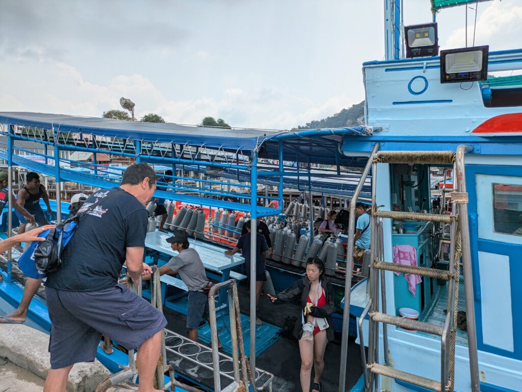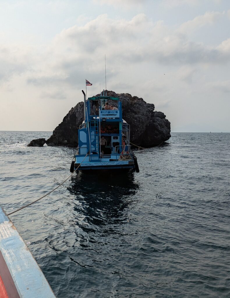 We both woke around 0300, but tried to sleep some more. Finally, at 0430, we both gave up and got around. We went out around 0515 to get to the dive shop at 0530. We were the first ones there. We were questioning if we should go to the pier when another diver showed up and then Jacob came. It was all in five minutes but when it is that early and the place was locked up, it makes you think you got the instructions wrong. Anyway, the other diver with us is Alex from London. We each grab our gear bag and walk to the pier. We boarded our boat. It is a two hour ride to the dive site, Sail Rock. I was a little nauseous and dizzy.🫤😵💫 Seasick? Jacob gave me a Benadryl equivalent. We were each given a breakfast sandwich of chicken, veggies and a great sauce. I only took a couple of bites, due to my earlier nausea and my body saying it was too early for food. Sometime here Jacob our dive guide told us Alex was a divemaster!