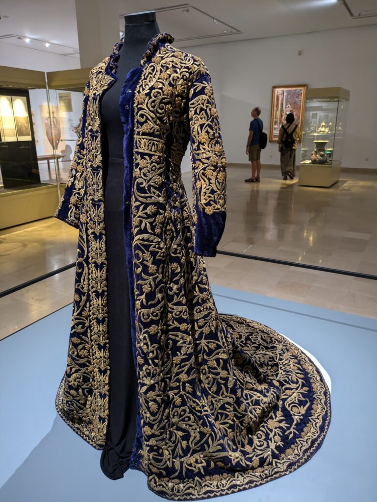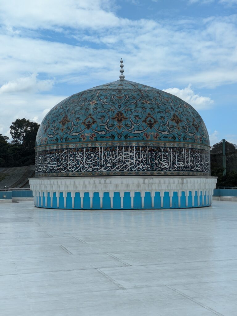 Next, we trekked down to the Islamic Arts Museum Malaysia. This was our first time here. It cost 20MYR ($4.78) and was fascinating. The special exhibit was called The Arabesque, “which is the distinctive decoration form of the Islamic world,” from the entry placard, and is “an ornamental motif… defined as the stylized leaves that branch and bifurcate to form endless intertwined scrolls… apparent on objects… in the Islamic world.” I treasure this stuff!! I could spent hours studying it, wanting to draw it! Anyway, the design is displayed on many different objects: embedded in fabric weaving- wall mountings to rich robes; to paintings- as a border or part of the setting in the actual picture; on decorative tiles; on vases- swirled on blown glass or cast in ceramic; wood pieces-jewelry boxes of inlaid motifs; and also on/in books- bookcovers, and the pages of opened Qurans. This was quite a special exhibit. Finally, Jeff “pulled me out” and we moved on to the other various permanent galleries. There was the Architecture Gallery – with displays of models of different Mosques around the world. Then I got ‘stuck’ in the Quran & Manuscript Gallery – Jeff “pulled me out” again. Other galleries were India, China, Malay World, and Jewerly. Then a second floor included Textile, Living with Wood, Arms & Armour, Coins & Seals, Metalwork, and lastly Ceramics Galleries. We were getting museumed out by now and skimmed the last ones. But overall I enjoyed the museum- it had been awhile since we had been to one. The building it was housed in was decorated with a couple of nice domes.