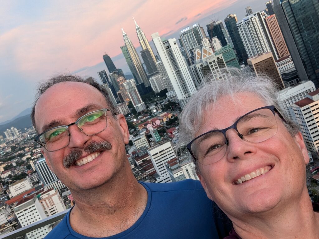 Now we rushed back to our place for sunset, deciding to go up to the pool area – which is the 35th and top floor, but in Tower A, “Milan” (our apartment is in Tower B, “Melrose”). This towers elevators are much faster, all working, but still full. We made it. So we did quick photo op. There were a bunch of people all doing the same thing – great views of the city, but sunset wasn’t that great from here. So we went back down to our room with a better, nicer sunset. Around 2030 we went back up to the pool aera and got the night sky view and more pictures, it was not as crowded, but still busy. Super fine day in KL!