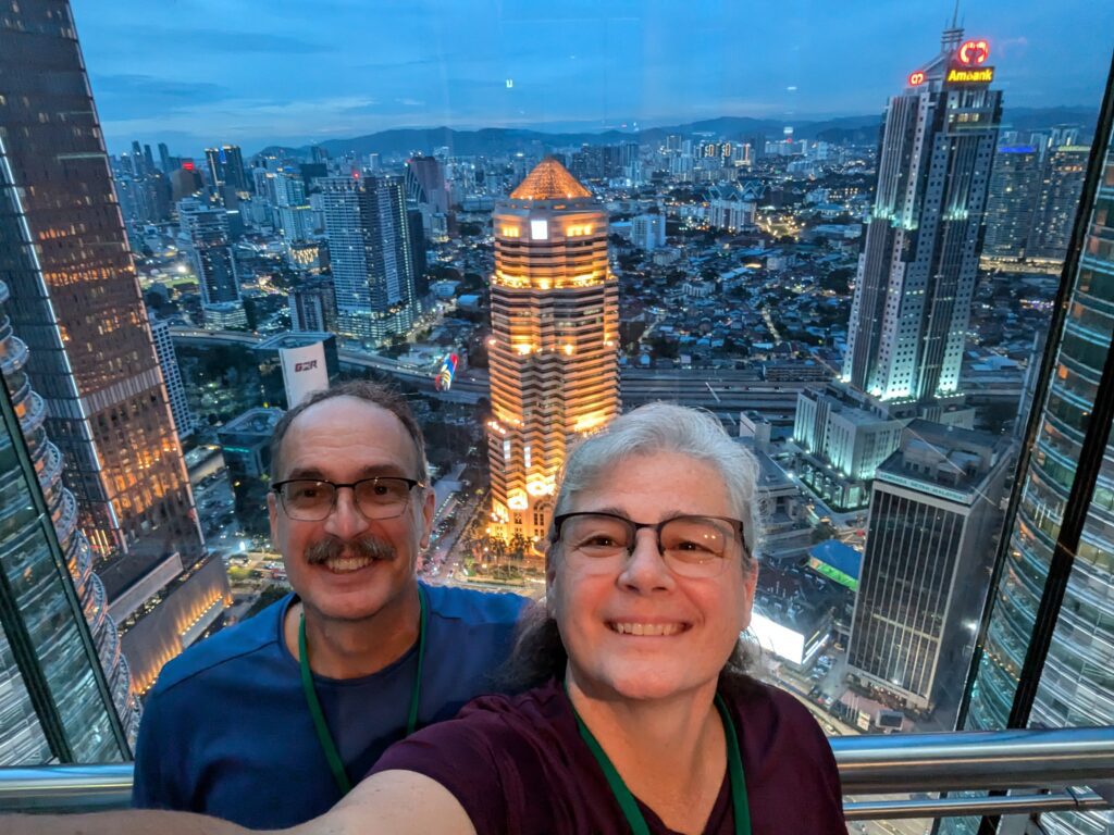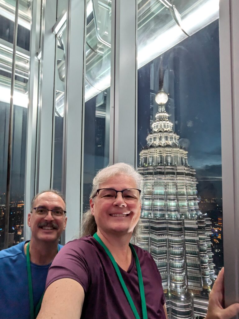 At 1700 we readied, because we have tickets for a 1915 tour of The Petronas Twin Towers. We left at 1730 to build in some slack time for our elevators; traffic getting there; and finding where to go for the tour. We did not go up these towers 13 years ago(tour was sold out. So I’m excited. The Twin Towers were completed in 1999. Another FYI: The movie Entrapment with Sean Connery and Catherine Zeta Jones had a sequence for the movie taken in this building. The filming was in 1998 before the building opened to the public. Anyway, via our third Grab taxi, we arrived at the complex (KLCC) that is a mall, a park, and the Twin Towers (TTs). The TTs are still the tallest twin tower structure in the world. This year it is celebrating it’s 25th year!! We found where to meet then explored the high end mall -Gucci, Ralph Lauren, Chanel, Rolex stores to only name a few. I think there was six levels! We found the two leveled food court, spying what we might eat after our tour. At 1845 we ‘boogied’ back to where the tour starts. Our tour group was the “green group” because our visitor passes were green neck lanyards. By 1915 we were all accounted for and ushered to a elevator that zoomed us up to the 41st floor. We were directed out into the Sky Bridge that is situated here between the towers! What a crazy view that was!! the towers themselves were lit up now as it is sunset. Stunning! Now our group is ushered to another elevator that took us up to the 83rd floor. Now we split into two groups to go into the next elevator (it’s smaller). We went up to the 86th floor – the highest we go (there are supposed to be 88). Now we are allowed to explore the area on our own. Dizzying views over Kuala Lumpur as the night sets in and lights come on. After around 20 minutes the green group is summoned to exit – a reversal of coming up. Once down we went outside at the back of the buildings and caught the light and sound show for ten minutes. It was okay – we have seen better.